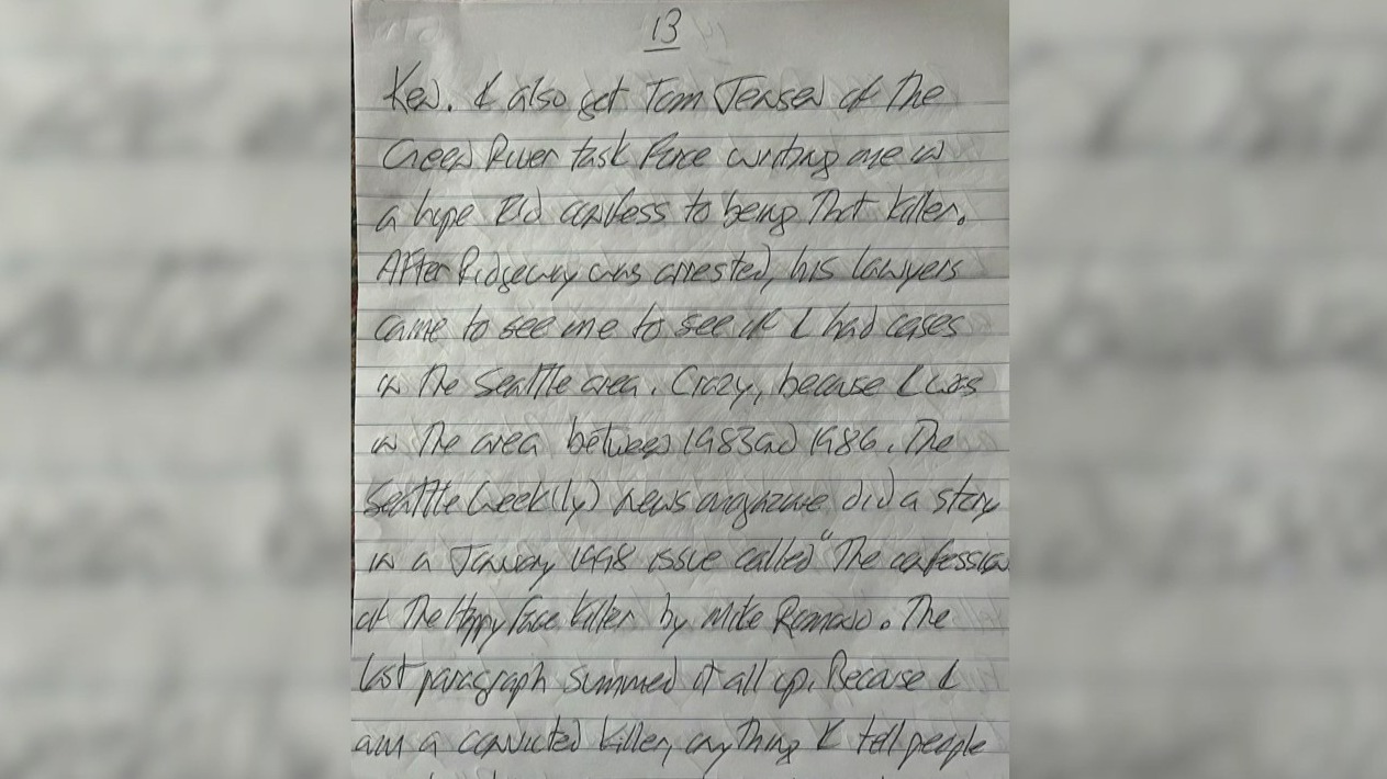 On page 13, he says, “I also got Tom Jensen of the green river task force writing me in hopes I’d confess to being that killer. After Ridgeway was arrested, his lawyers came to see me to see if I had cases in the Seattle area. Crazy, because I was in the area between 1983 and 1986. The Seattle weekly news magazine did a story in a January 1998 issue called “The Confessions of the Happy Face Killer” by Mike Romano. The last paragraph summed it all up. Because I am a convicted killer, anything I tell people can be taken as something it isn’t.”