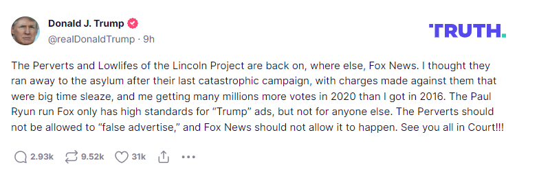 (NewsNation) — Donald Trump reportedly threatened to sue Fox News Thursday after the network aired a “false advertisement” about him from the Lincoln Project.