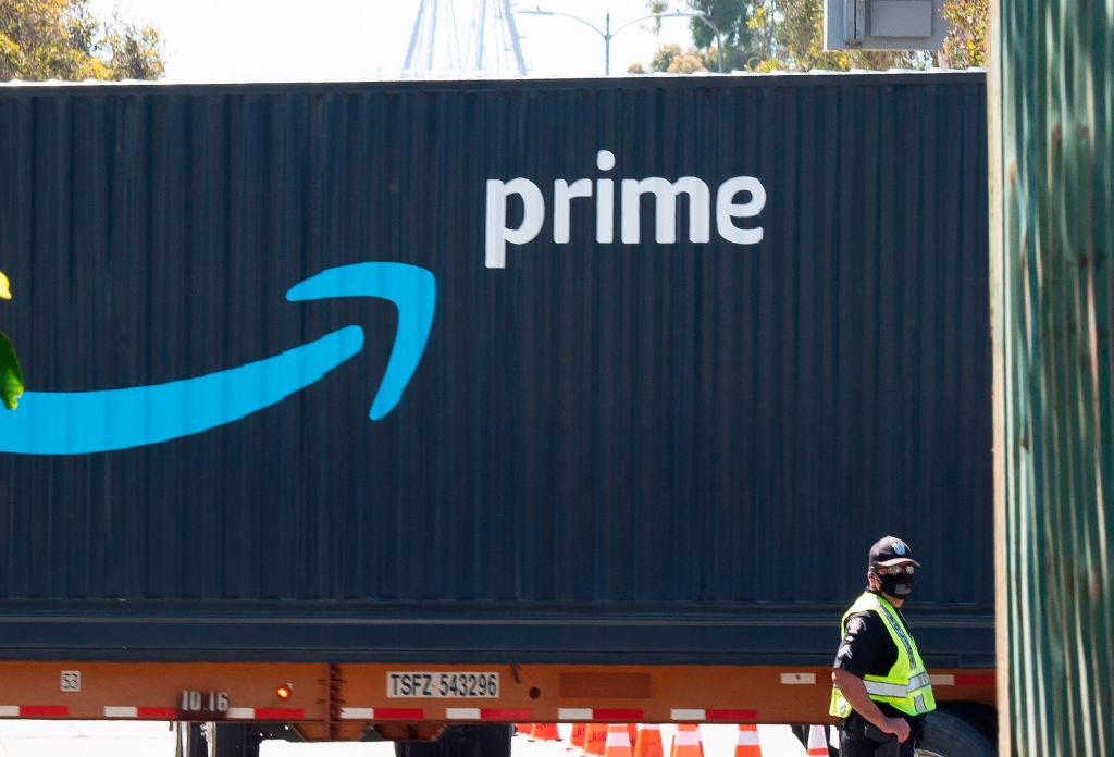 An Amazon Prime delivery truck drives through the Port of Los Angeles and Long Beach April 22, 2020 in Long Beach, California. (Photo by Robyn Beck / AFP) (Photo by ROBYN BECK/AFP via Getty Images)