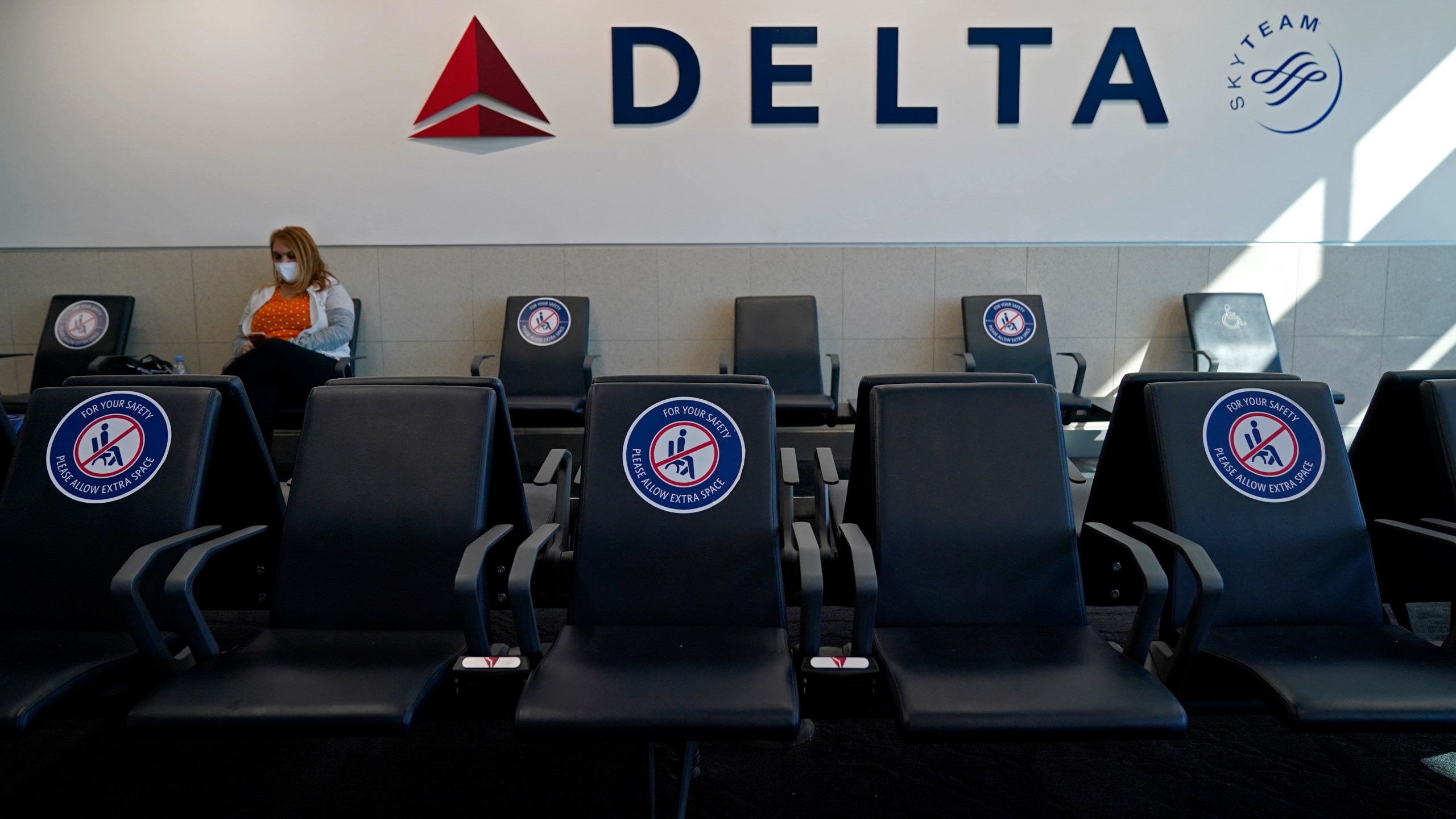 FILE – A passenger wears a face mask as she waits in a socially-distance area for a Delta Airlines flight, Wednesday, Feb. 3, 2021, at Hartsfield-Jackson International Airport in Atlanta. Delta Air Lines will start paying flight attendants during the time that passengers are boarding. That’s a first for a major U.S. airline. Flight attendants in the U.S. generally don’t begin getting paid until the doors close after boarding. Delta said Tuesday, April 26, 2022, that the change will take effect in June, and it comes on top of pay raises for flight attendants. The pay increase comes as Delta faces another attempt by unions to organize its non-union flight attendants. (AP Photo/Charlie Riedel, File)
