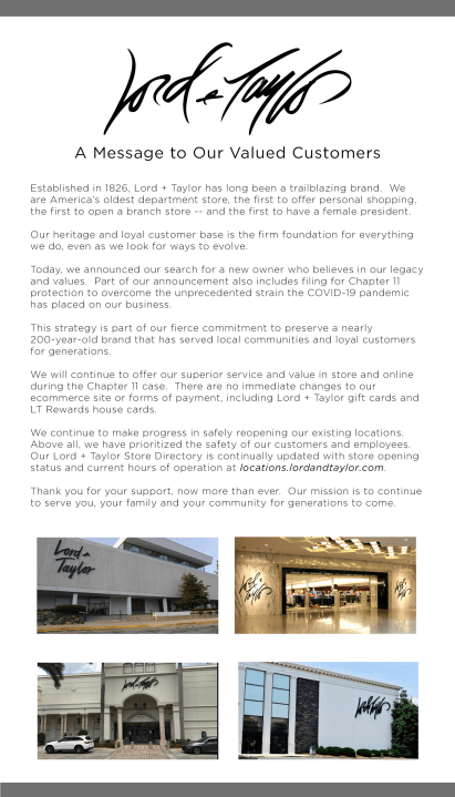 NEW YORK (AP) — Lord & Taylor, one of America’s oldest department stores, has filed for bankruptcy, joining a growing list of stores damaged by the coronavirus pandemic. Tailored Brands, the parent company of Men’s Wearhouse and Jos. A. Banks, filed for bankruptcy as well.
