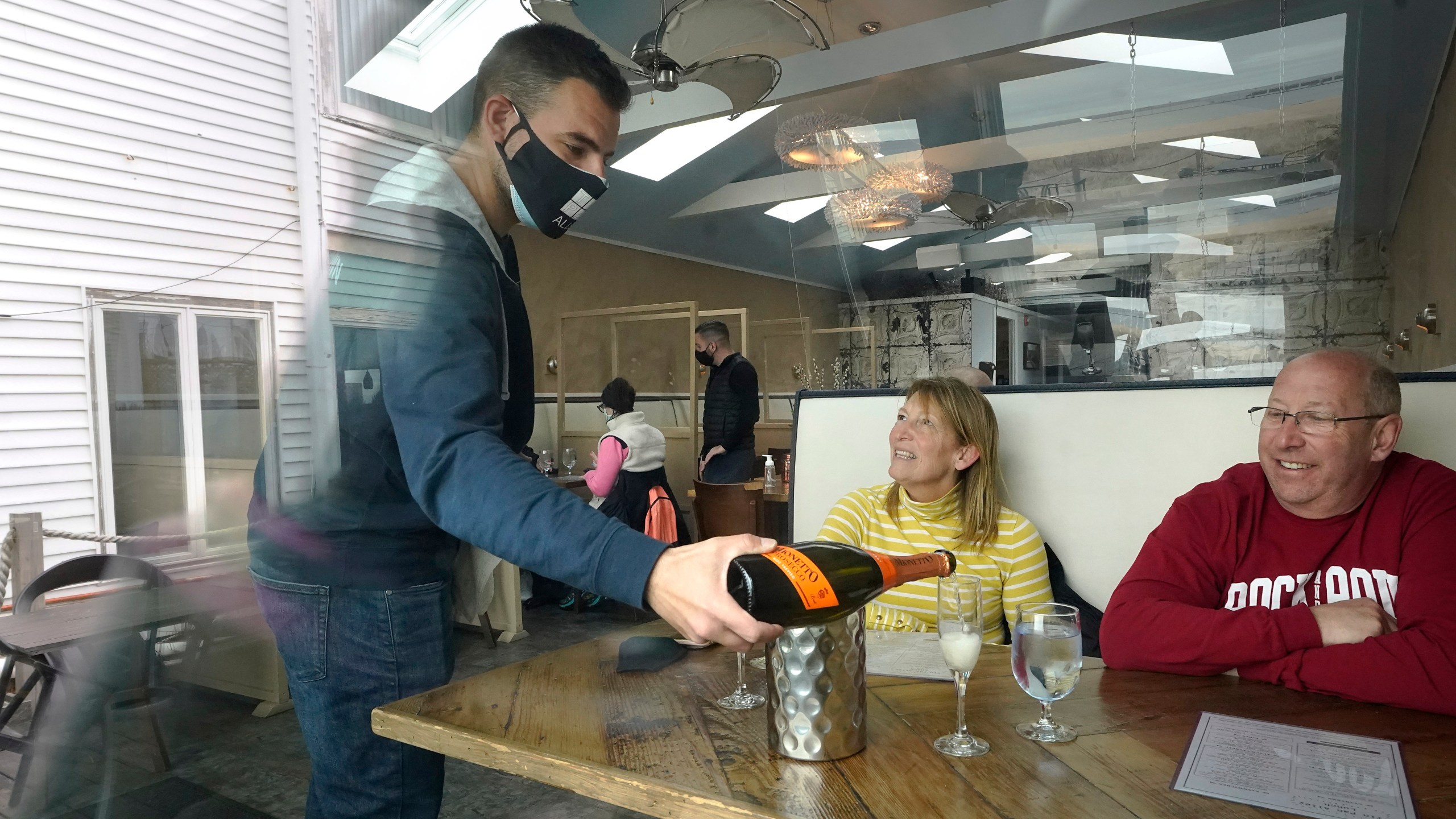 Bartender Denis Angelov, of Provincetown, Mass., left, serves sparking wine to Julie Skaller, left, and her husband David Skaller, right, both of Brewster, N.Y., at Tin Pan Alley restaurant, Tuesday, April 6, 2021, in Provincetown. Hotels, restaurants and other businesses in tourist destinations are warning that hiring challenges during the coronavirus pandemic could force them to pare back operating hours or curtail services just as they’re eyeing a bounce-back summer. (AP Photo/Steven Senne)