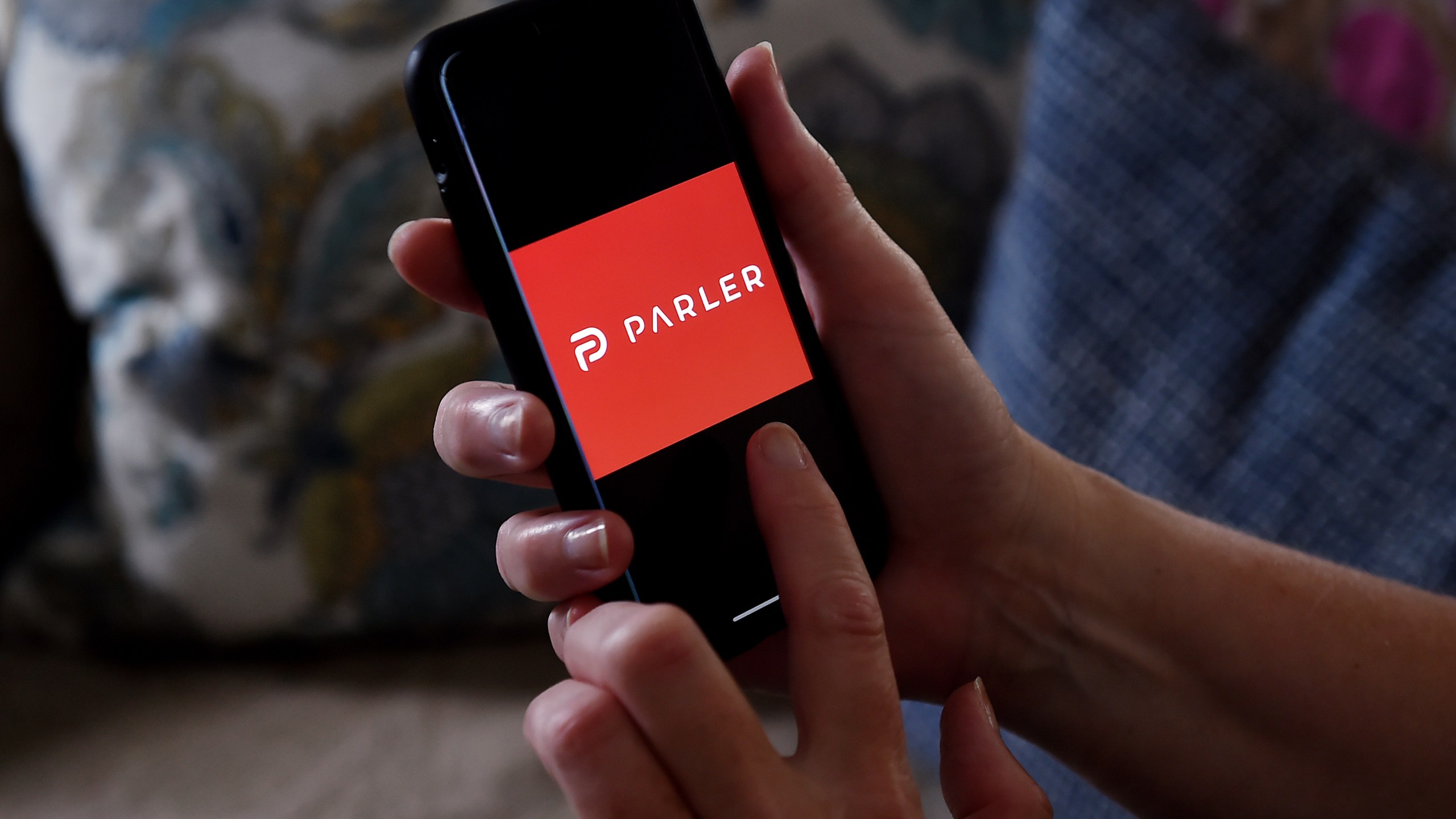 This illustration picture shows social media application logo from Parler displayed on a smartphone in Arlington, Virginia on July 2, 2020. (Photo by OLIVIER DOULIERY/AFP via Getty Images)