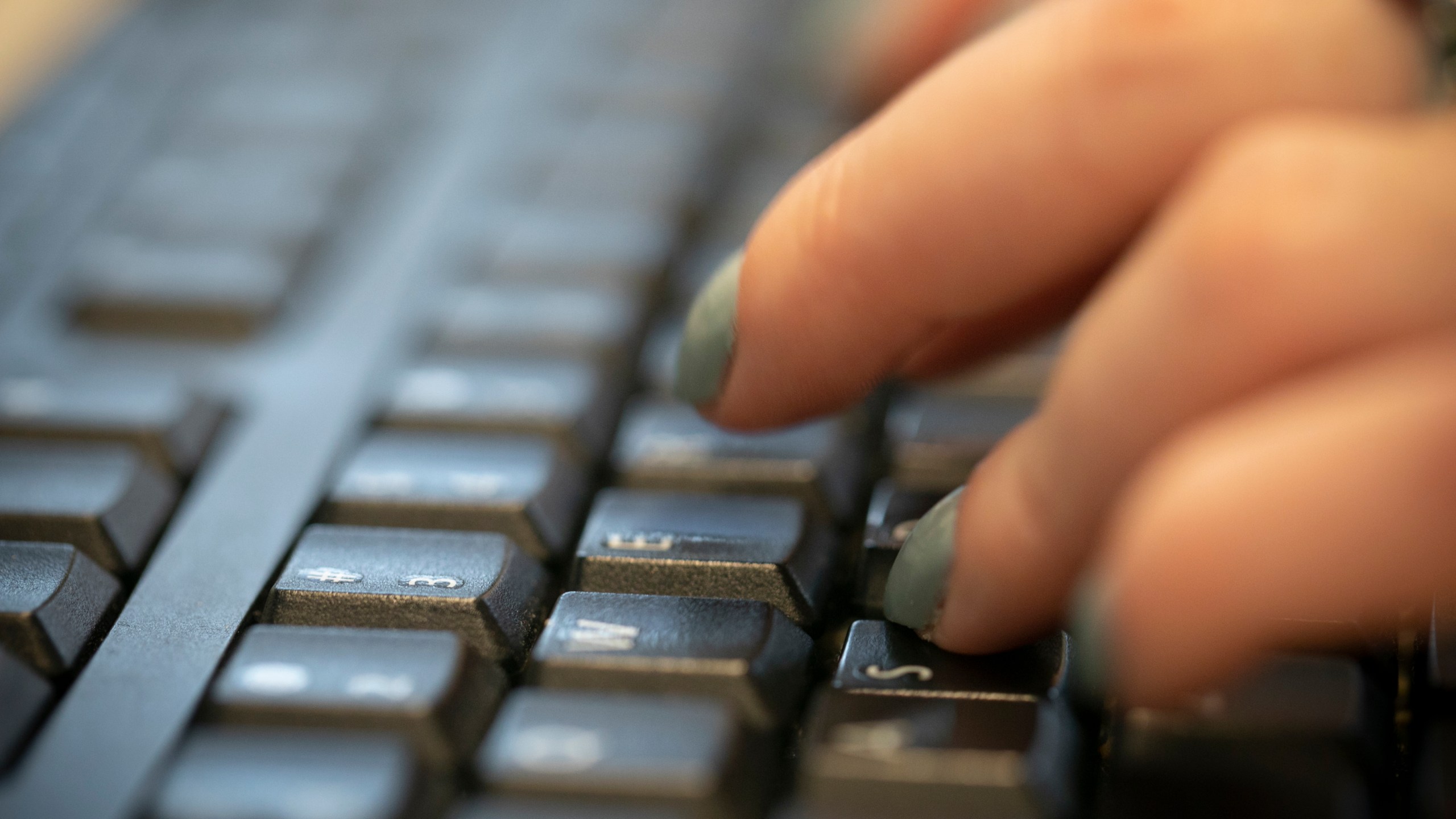 In this Tuesday, Oct. 8, 2019, photo a woman types on a keyboard in New York. (AP Photo/Jenny Kane)