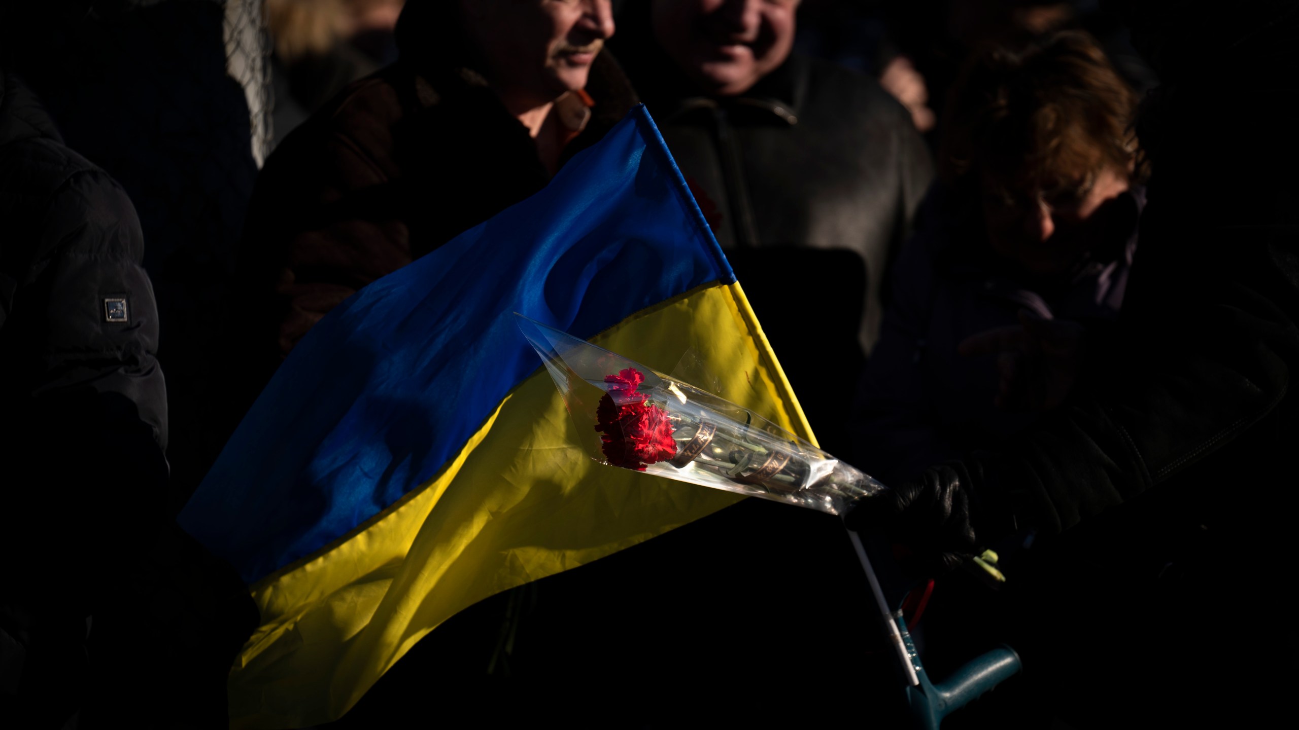 People attend a ceremony to mark the anniversary of the withdrawal of Soviet troops from Afghanistan in the city of Kyiv, Ukraine, Tuesday, Feb. 15, 2022. Russia says that some units participating in military exercises will begin returning to their bases. That adds to glimmers of hope that the Kremlin may not be planning to invade Ukraine imminently. (AP Photo/Emilio Morenatti)