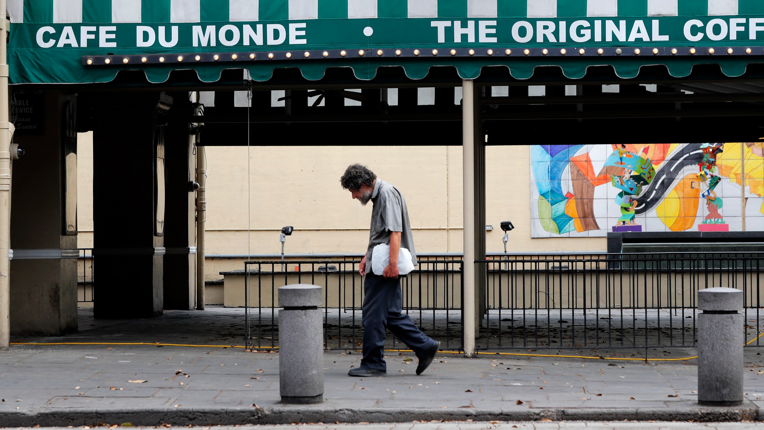 FILE – In this March 27, 2020, file photo, a man walks past the Cafe Du Monde restaurant, which was closed but has since reopened, in the French Quarter of New Orleans. President-elect Joe Biden will inherit a mangled U.S. economy, one that never fully healed from the coronavirus and could suffer again as new infections are climbing. The once robust recovery has shown signs of gasping after federal aid lapsed. Ten million remain jobless and more layoffs are becoming permanent. The Federal Reserve found that factory output dropped. (AP Photo/Gerald Herbert, File)