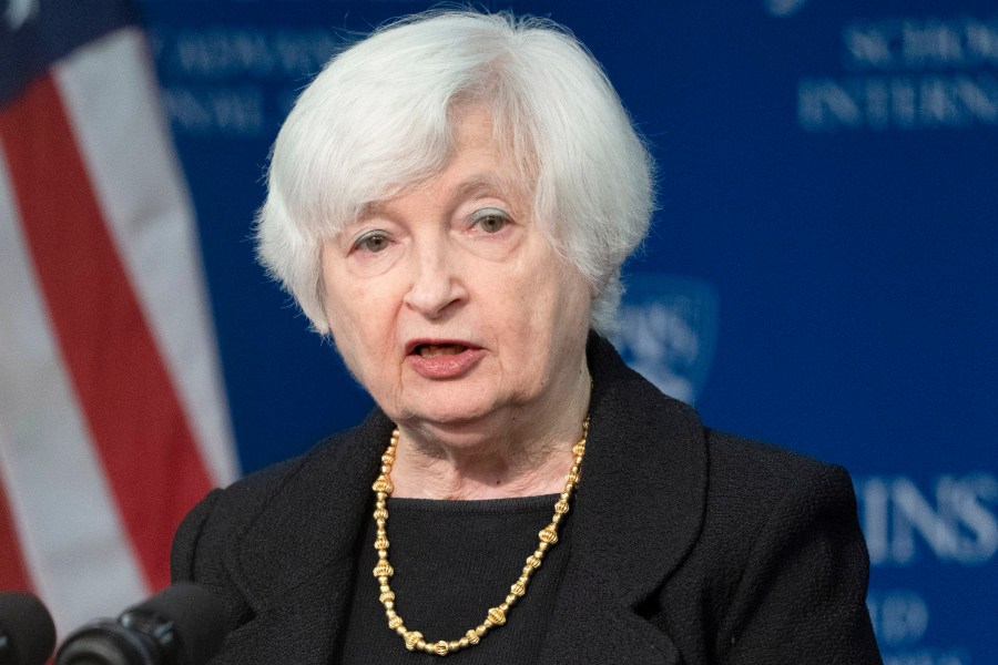FILE – Treasury Secretary Janet Yellen speaks on the U.S.-China economic relationship at Johns Hopkins University School of Advanced International Studies, Thursday, April 20, 2023, in Washington. Yellen said Sunday that there are “no good options” for the United States to avoid an economic “calamity” if Congress fails to raise the nation’s borrowing limit of $31.381 trillion in the coming weeks. She did not rule out President Joe Biden bypassing lawmakers and acting on his own to try to avert a first-ever federal default. (AP Photo/Manuel Balce Ceneta, File)
