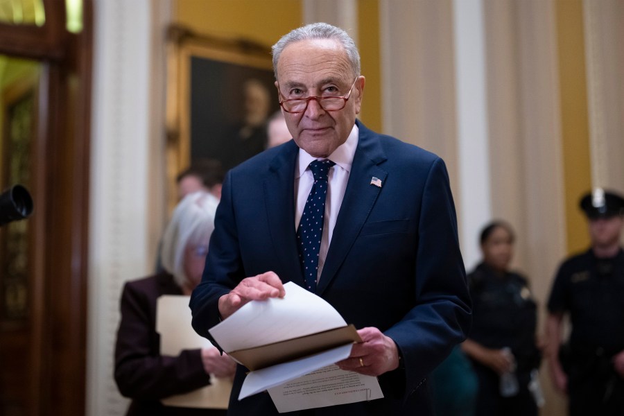 FILE – Senate Majority Leader Chuck Schumer, D-N.Y., arrives to talk to reporters at the Capitol in Washington, Tuesday, May 2, 2023. Facing the risk of a government default as soon as June 1, President Joe Biden has invited the top four congressional leaders to a White House meeting for talks on Tuesday, May 9. (AP Photo/J. Scott Applewhite, File)