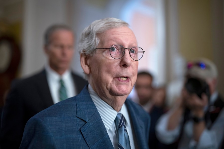 FILE – Senate Minority Leader Mitch McConnell, R-Ky., talks with reporters following a closed-door strategy session, at the Capitol in Washington, Tuesday, April 18, 2023. Facing the risk of a government default as soon as June 1, President Joe Biden has invited the top four congressional leaders to a White House meeting for talks on Tuesday, May 9. (AP Photo/J. Scott Applewhite, File)