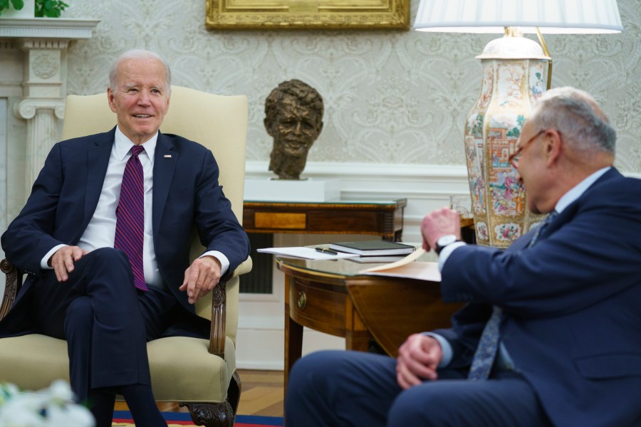 Senate Majority Leader Chuck Schumer of New York listens as President Joe Biden speaks before a meeting to discuss the debt limit in the Oval Office of the White House, Tuesday, May 9, 2023, in Washington. (AP Photo/Evan Vucci)