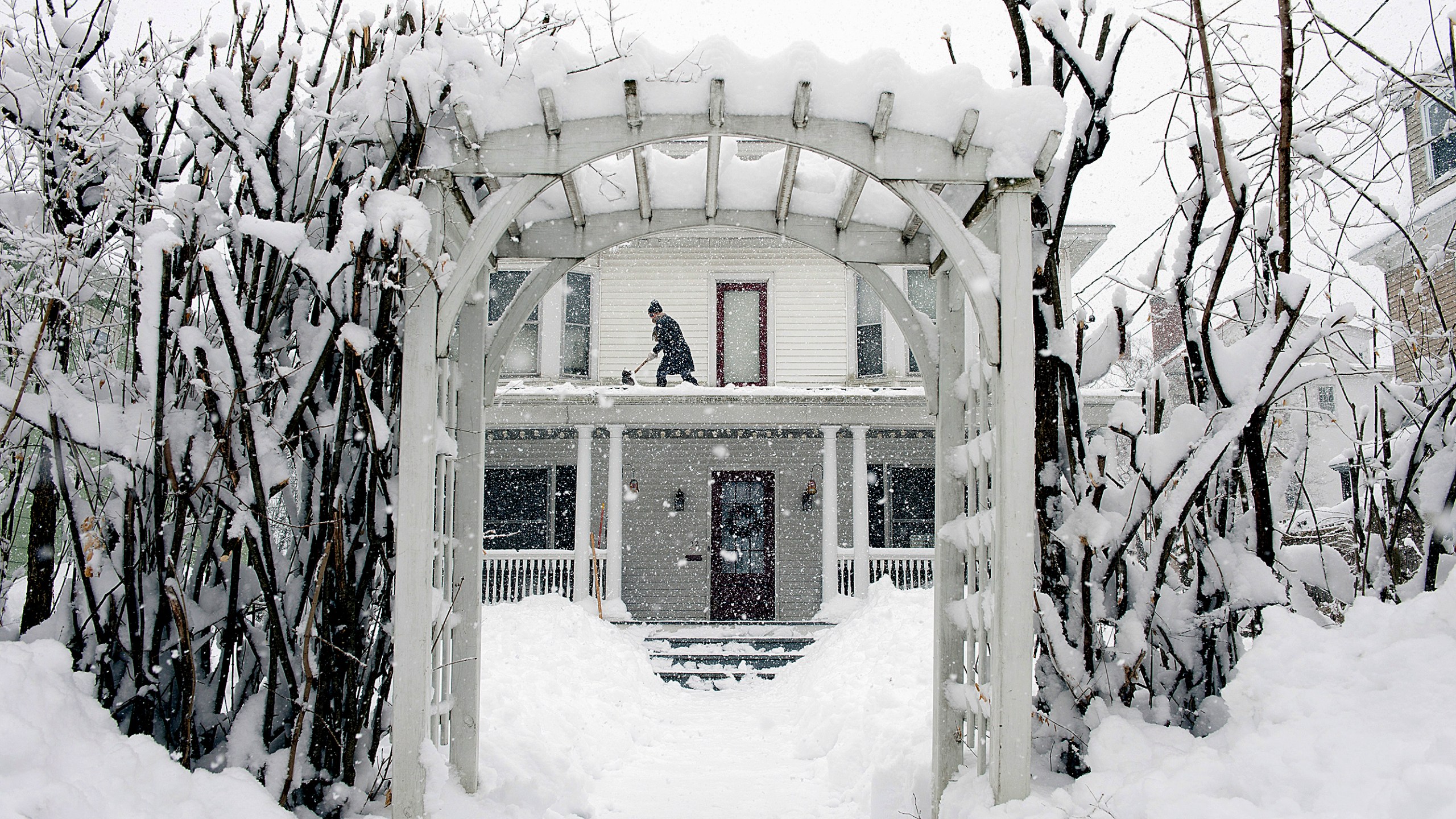 FILE – Amber Cox shovels snow from the porch roof at her home in Auburn, Maine, on March 8, 2018. With prices surging worldwide for heating oil, natural gas and other fuels, the U.S. government said Wednesday, Oct. 13, 2021 it expects households to see jumps of up to 54% for their heating bills compared to last winter. (Daryn Slover/Sun Journal via AP)