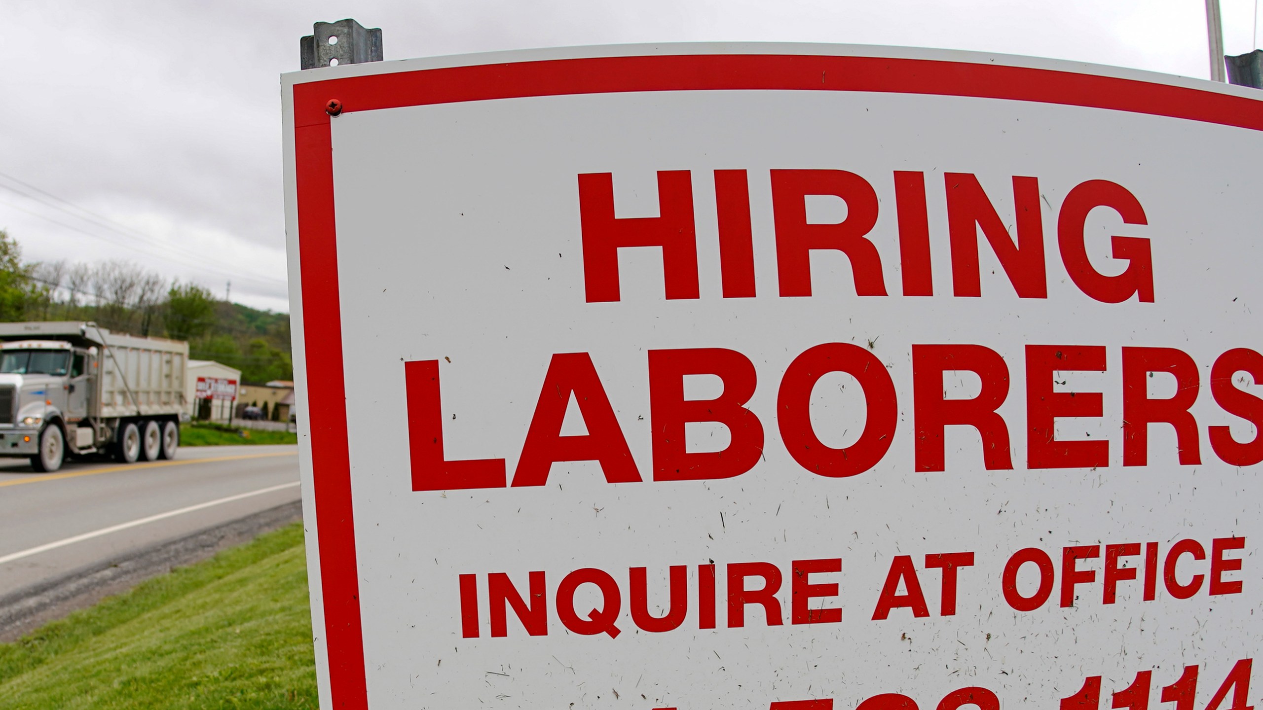 FILE—In this file photo from May 5, 2021, a truck passes a sign showing a need to hire laborers outside a concrete products company in Evans City, Pa. Pennsylvania will resume work search requirements in July for hundreds of thousands of people receiving unemployment compensation, a top Wolf administration official said Monday, May 24, 2021. (AP Photo/Keith Srakocic, File)