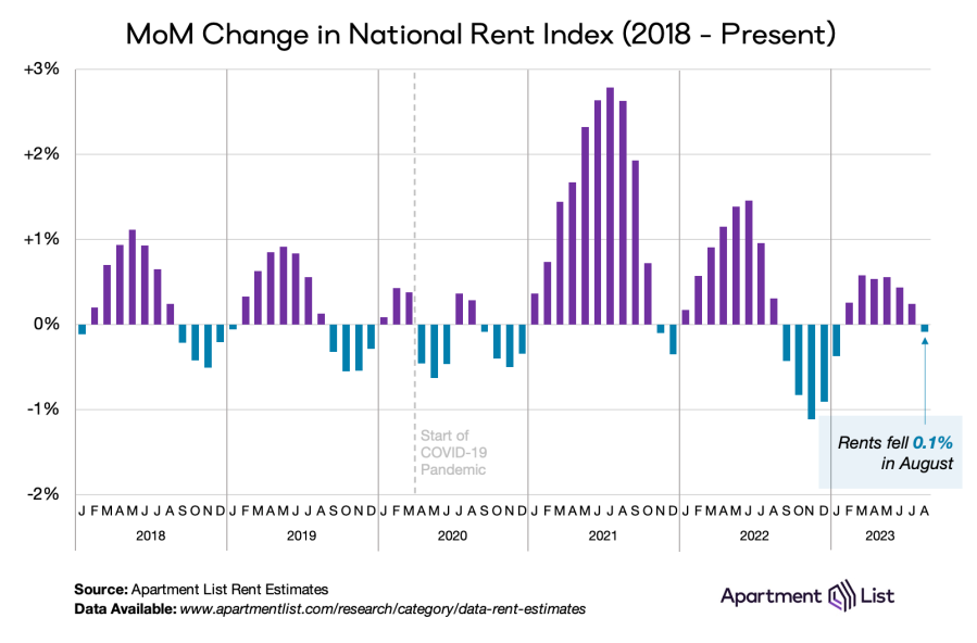 The national rent index decreased by 0.1% in August, and rents are down by 1.2% compared to a year ago. In other words, apartments across the country are 1.2% cheaper today than a year ago.