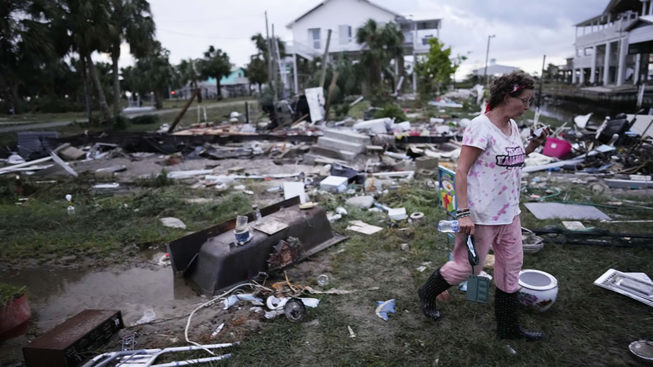 File – Jewell Baggett walks amidst debris strewn across the yard where her mother’s home had stood, in Horseshoe Beach, Fla., after the passage of Hurricane Idalia, on Aug. 30, 2023. Information theft is on the rise. Frauds and scams often emerge during specific incidents such as the COVID pandemic, and in the wake of climate-related catastrophes. (AP Photo/Rebecca Blackwell, File)