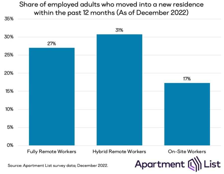 Apartment List surveyed 6,000 employed American adults in December 2022, and those with remote work arrangements were far more likely to have moved into a new home over the last year.