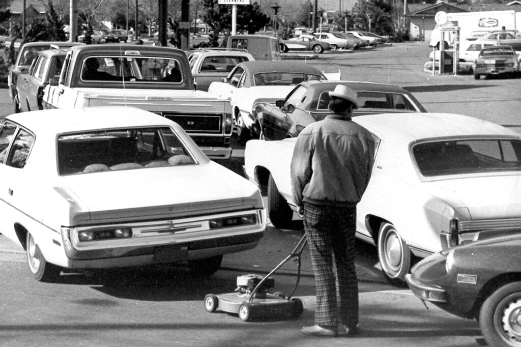 FILE – Drivers and a man pushing a lawnmower line up at gas station in San Jose, Calif., on March 15, 1974. An unhappy confluence of events has economists reaching back to the days of disco and the bleak high-inflation, high-unemployment economy of nearly a half century ago. No one thinks stagflation is in sight. But as a longer-term threat, it can no longer be dismissed. (AP Photo/File)