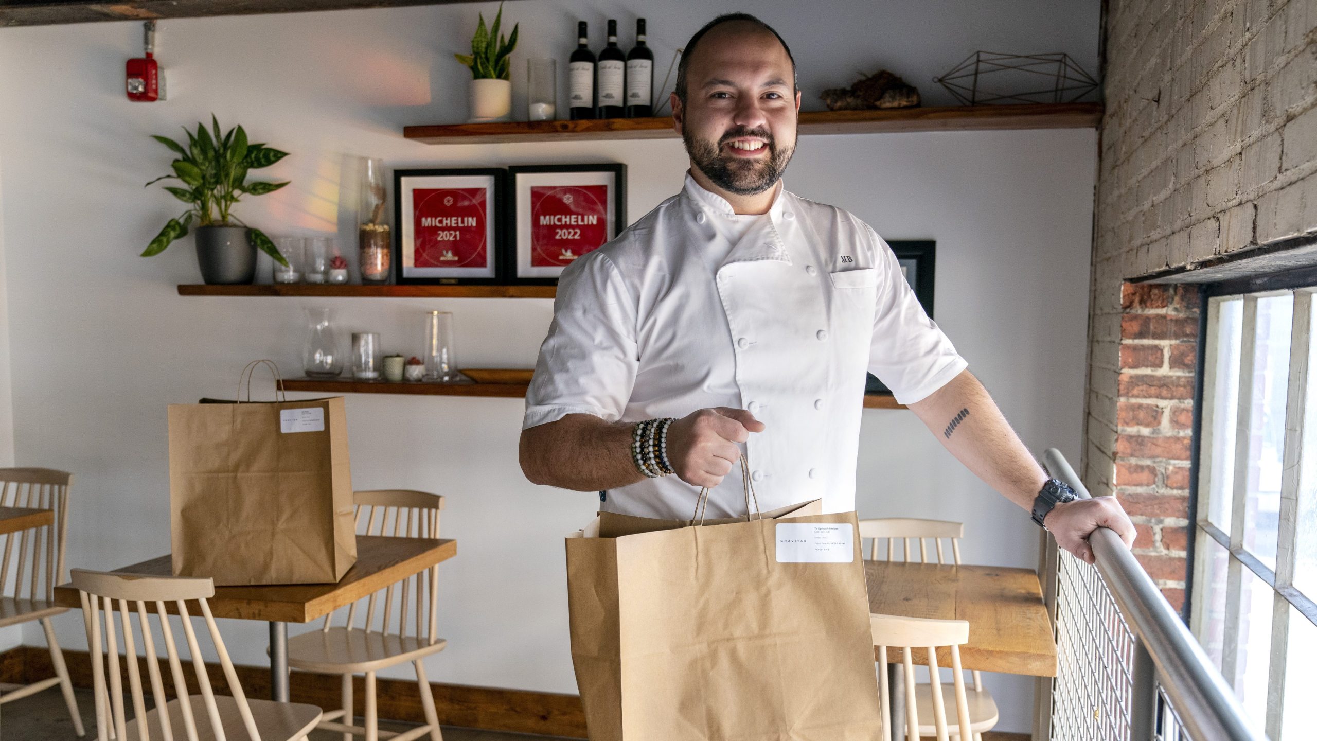 Matt Baker, chef and owner of Gravitas, poses for a portrait inside the restaurant, Tuesday, Feb. 14, 2023, in Washington. Gravitas has a subscription service offering a monthly meal for two. (AP Photo/Jacquelyn Martin)