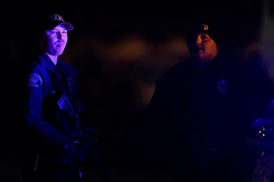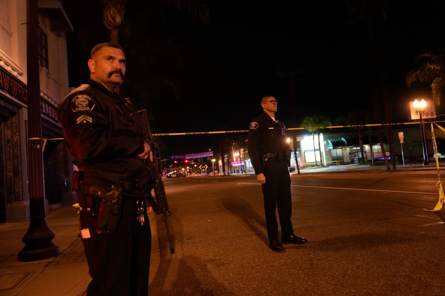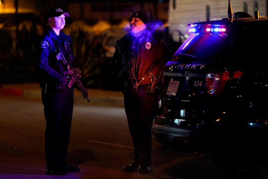 Two police officers stand guard near a scene where a shooting took place in Monterey Park, Calif., Sunday, Jan. 22, 2023. Dozens of police officers responded to reports of a shooting that occurred after a large Lunar New Year celebration had ended in a community east of Los Angeles late Saturday. (AP Photo/Jae C. Hong)
