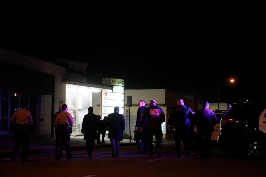 Investigators gather at a scene where a shooting took place in Monterey Park, Calif., Sunday, Jan. 22, 2023. Dozens of police officers responded to reports of a shooting that occurred after a large Lunar New Year celebration in a community east of Los Angeles late Saturday. (AP Photo/Jae C. Hong)