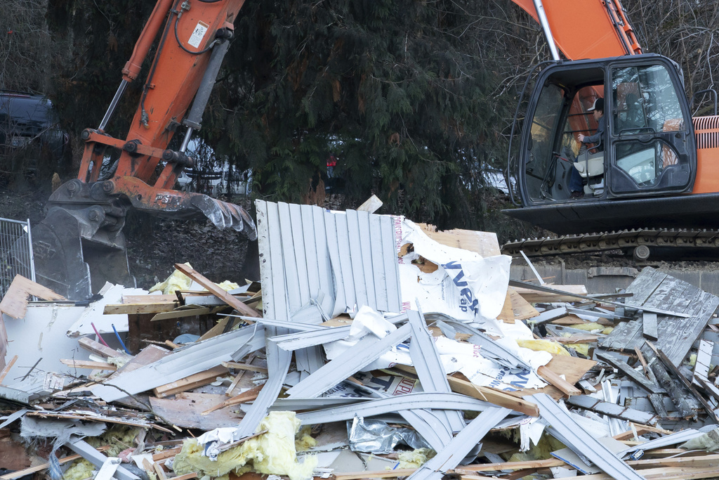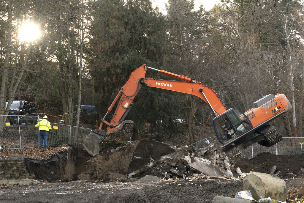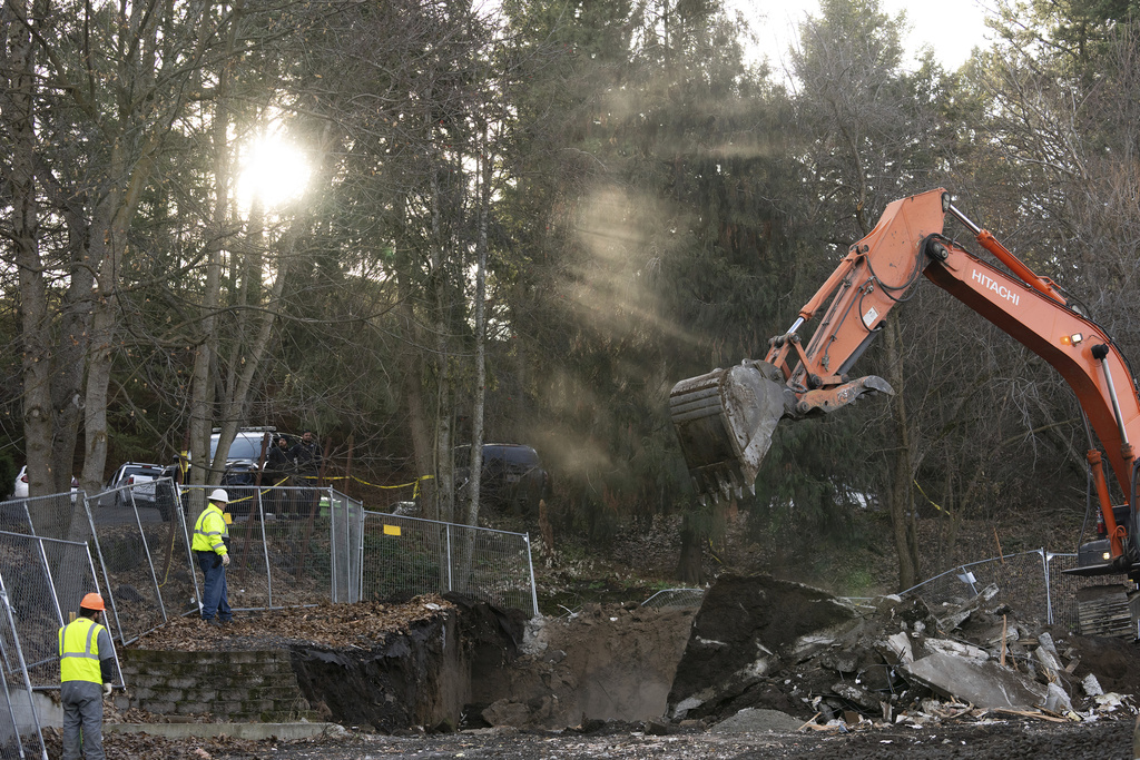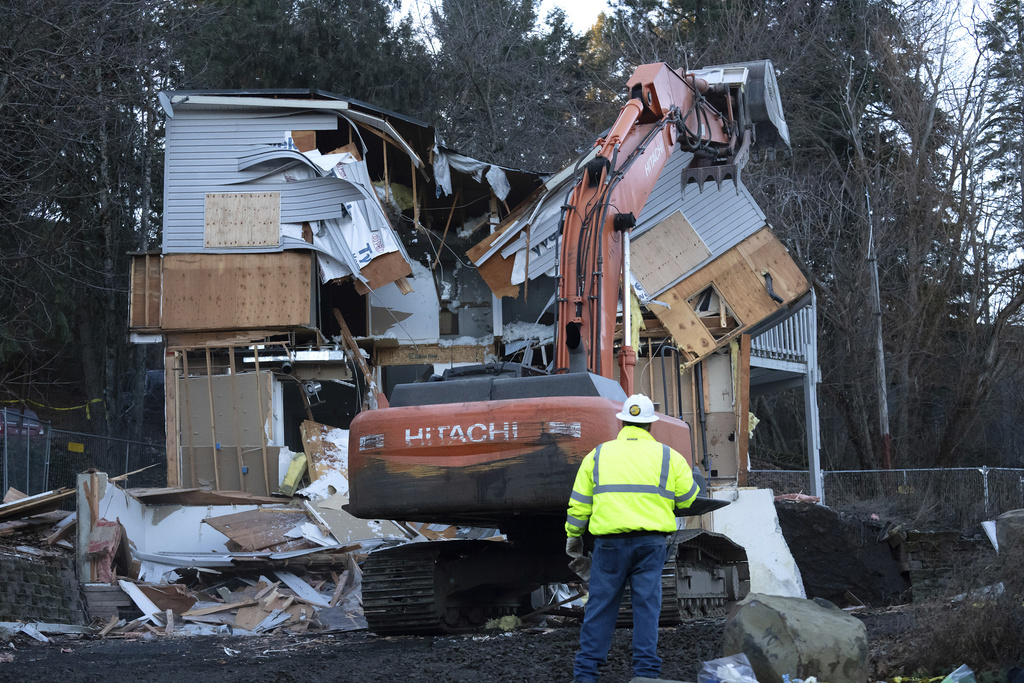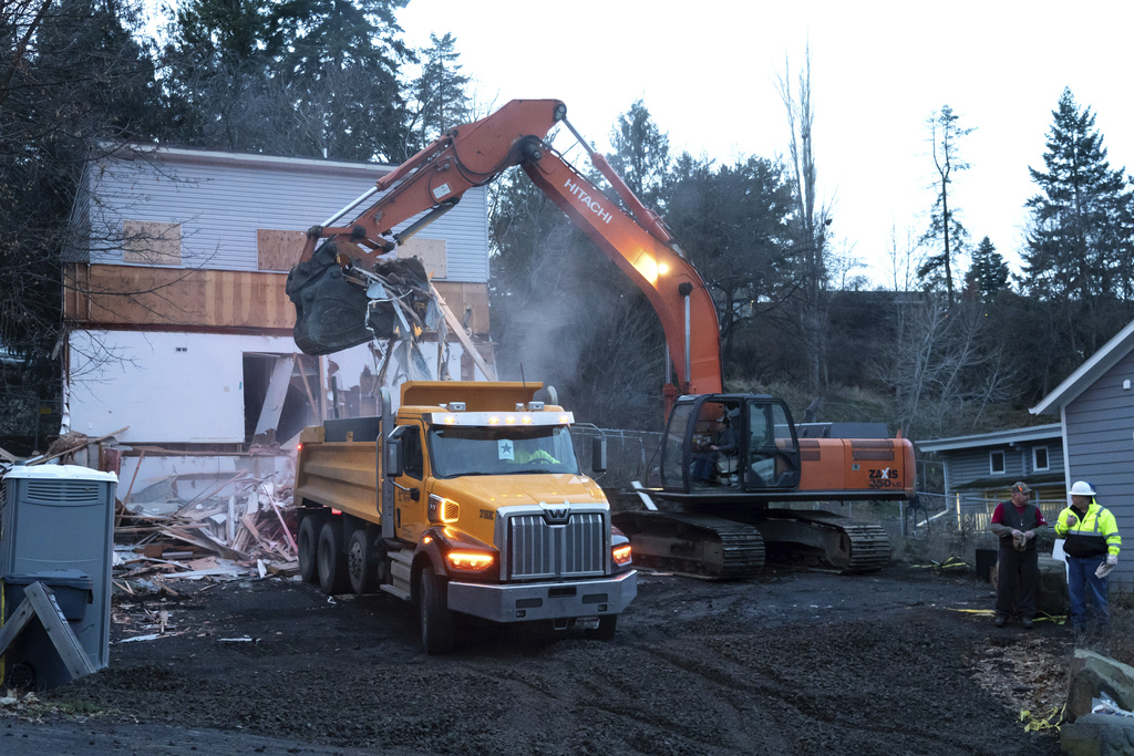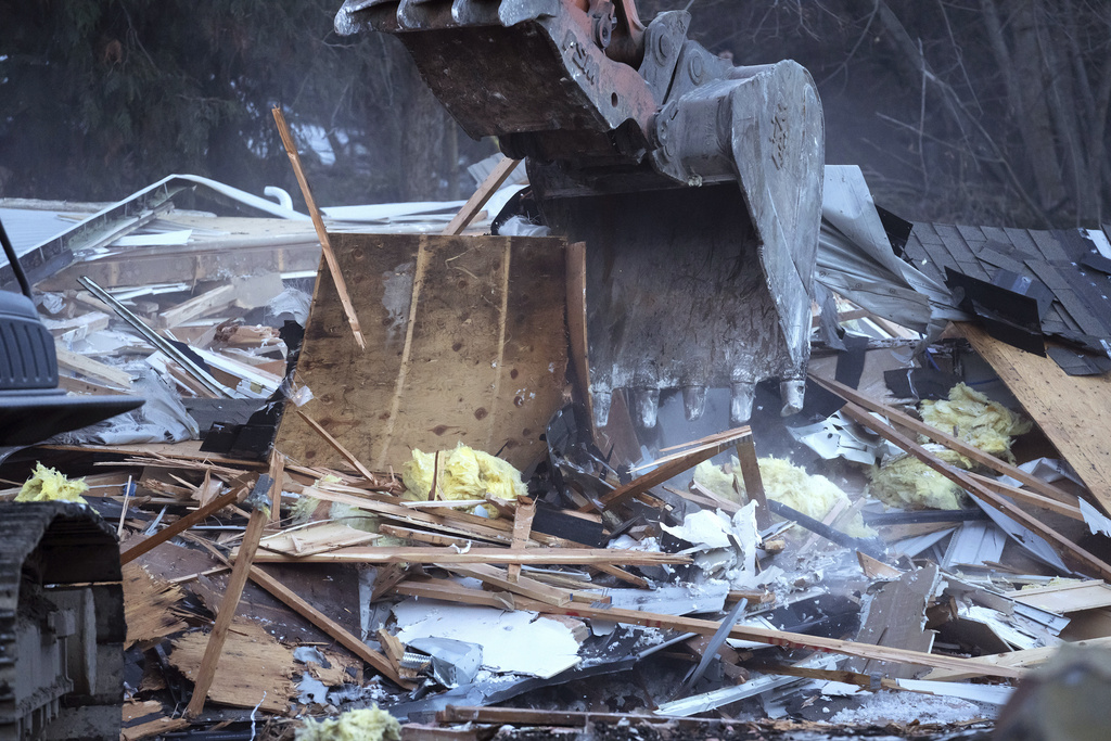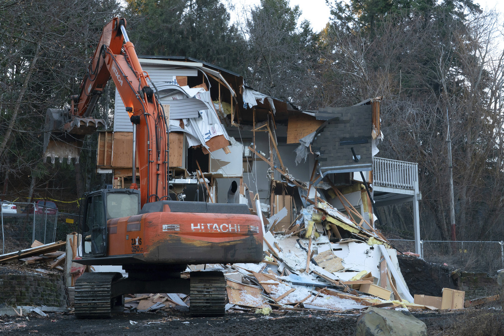 Heavy equipment is used to demolish the house where four University of Idaho students were killed in 2022 on Thursday, Dec. 28, 2023, in Moscow, Idaho. (AP Photo/Ted S. Warren)