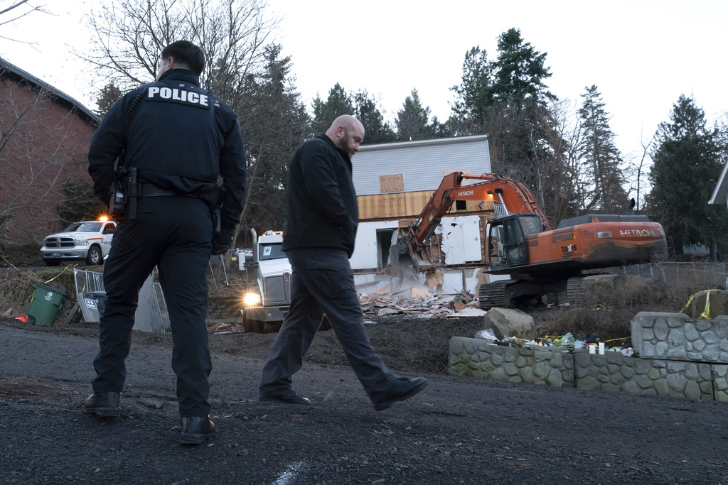 Police officers look on as heavy equipment is used to demolish the house where four University of Idaho students were killed in 2022 on Thursday, Dec. 28, 2023, in Moscow, Idaho. (AP Photo/Ted S. Warren)
