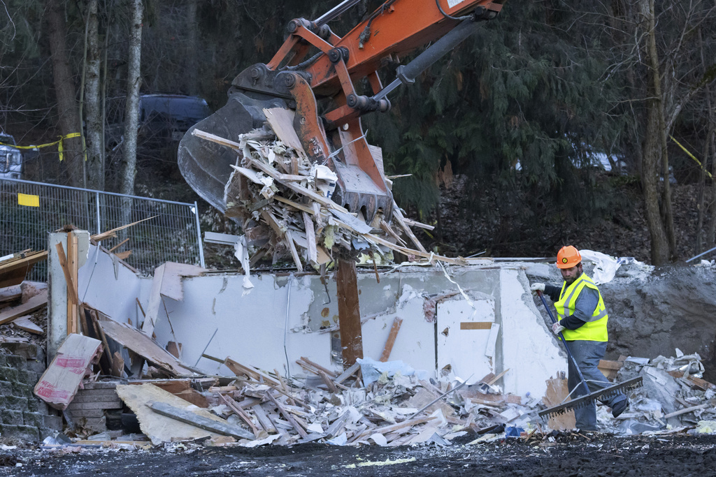 A worker rakes debris during a pause in the use of heavy equipment to demolish the house where four University of Idaho students were killed in 2022 on Thursday, Dec. 28, 2023, in Moscow, Idaho. (AP Photo/Ted S. Warren)