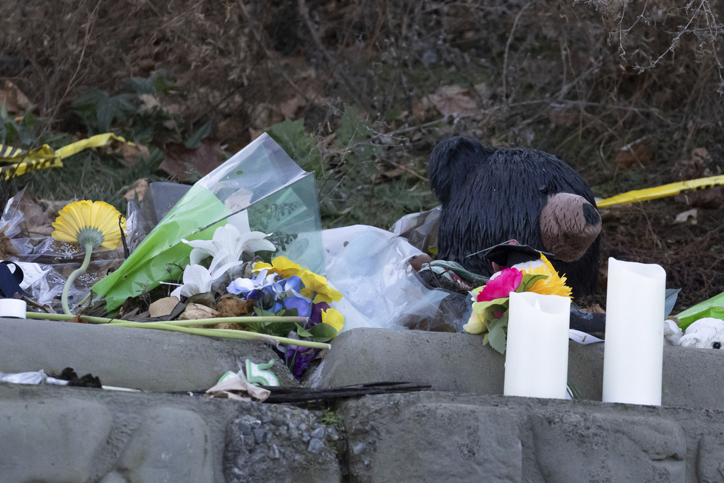 A stuffed animal, candles, and flowers are shown at the curb as heavy equipment is used to demolish the house where four University of Idaho students were killed in 2022 on Thursday, Dec. 28, 2023, in Moscow, Idaho. (AP Photo/Ted S. Warren)