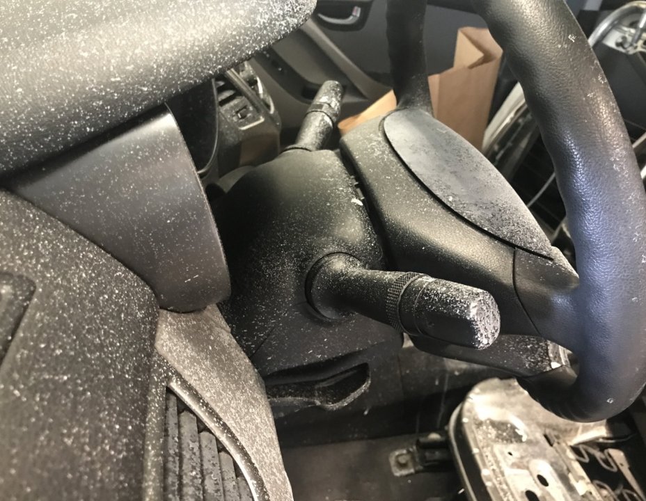 The photos show several views of the car after the interior was stripped for testing. It appears to be sprayed with a white substance, presumably used to detect fluid or fingerprints.