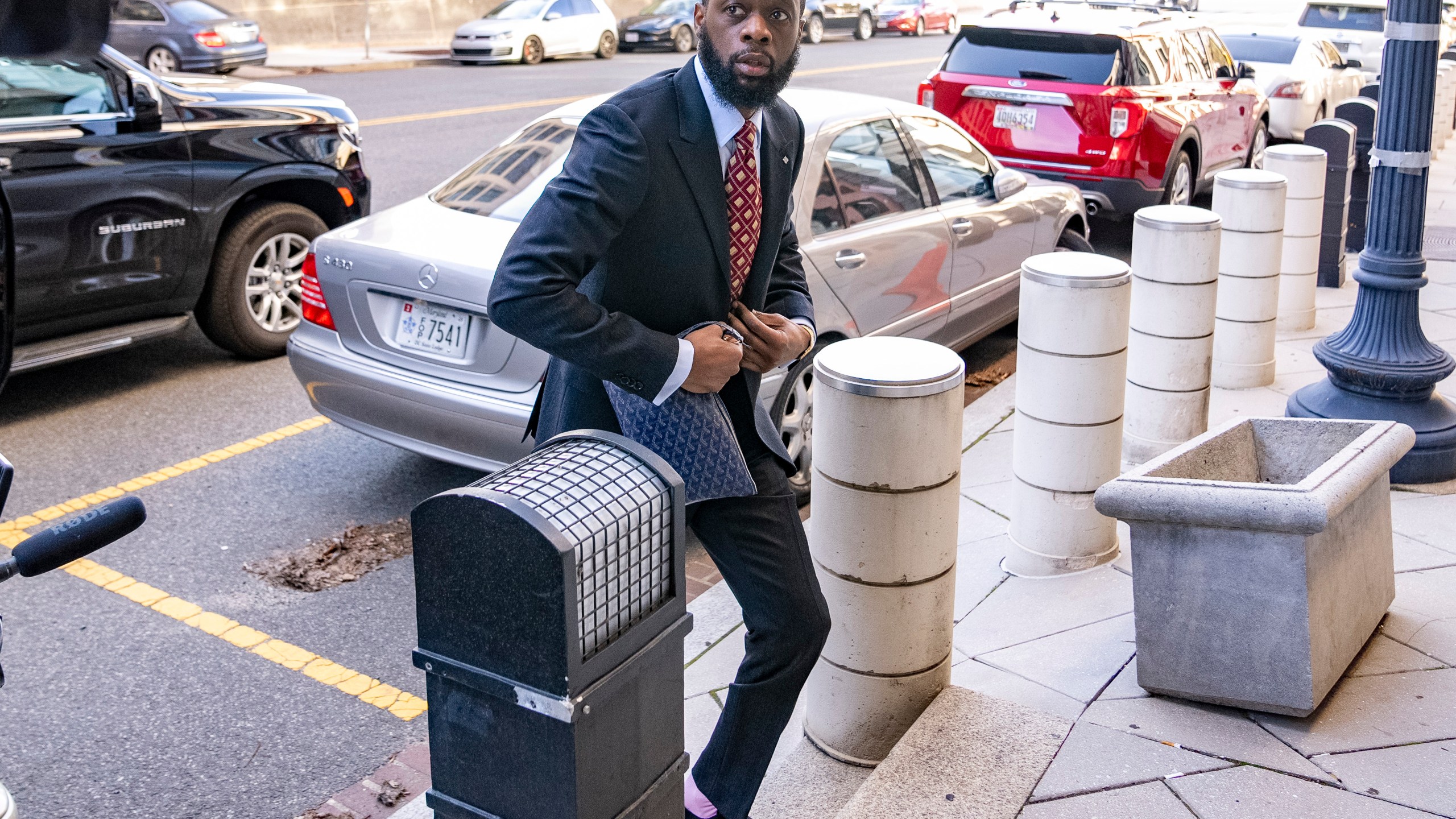 Prakazrel “Pras” Michel, a member of the 1990s hip-hop group the Fugees arrives at federal court for his trial in an alleged campaign finance conspiracy, Monday, April 3, 2023, in Washington. (AP Photo/Andrew Harnik)