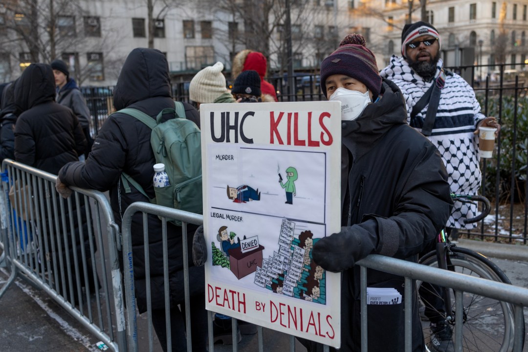 NEW YORK, NEW YORK – DECEMBER 23: A protestor holds a sign outside of Manhattan Criminal Court on December 23, 2024 in New York City. Luigi Mangione appeared for his arraignment on state murder charges in the killing of UnitedHealthcare CEO Brian Thompson. (Andrew Lichtenstein/Corbis via Getty Images)