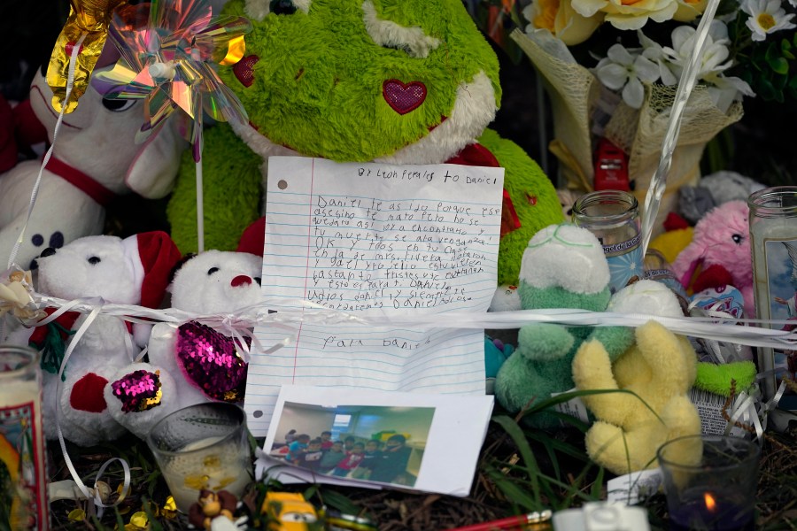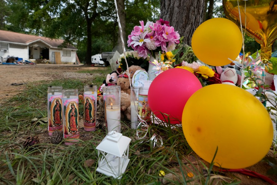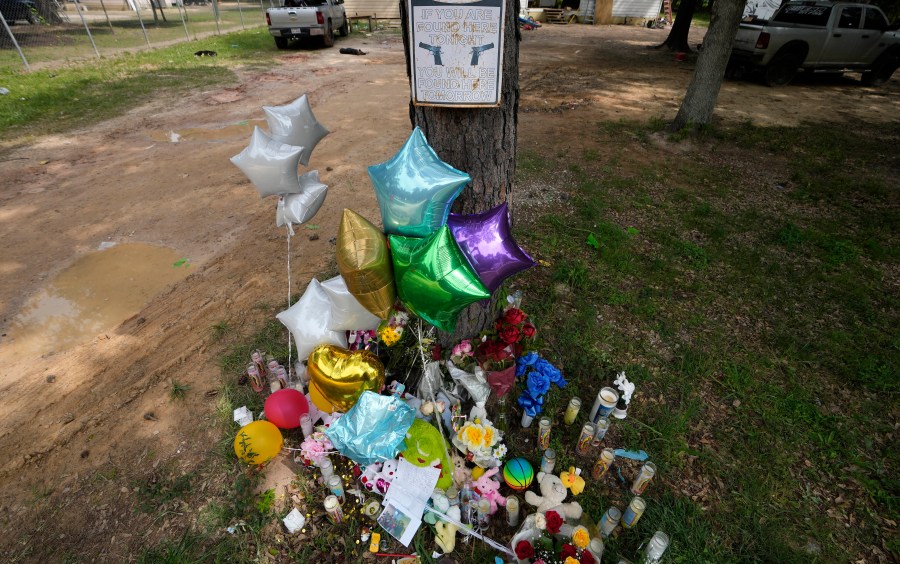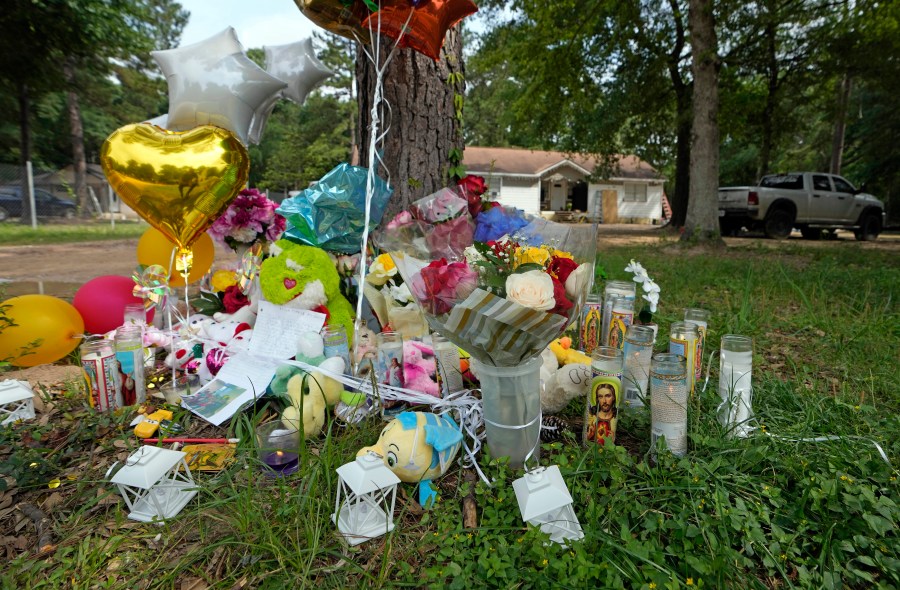 A makeshift memorial is shown Tuesday, May 2, 2023, outside the home where a mass shooting occurred Friday, in Cleveland, Texas. The search for the suspected gunman who allegedly shot five of his neighbors, including a child, after they asked him to stop firing off rounds in his yard stretched into a fourth day Tuesday. (AP Photo/David J. Phillip)