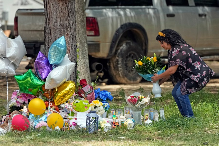 Maria Rodriguez places flowers Tuesday, May 2, 2023, outside the home where a mass shooting occurred Friday, in Cleveland, Texas. The search for the suspected gunman who allegedly shot five of his neighbors, including a child, after they asked him to stop firing off rounds in his yard stretched into a fourth day Tuesday. (AP Photo/David J. Phillip)