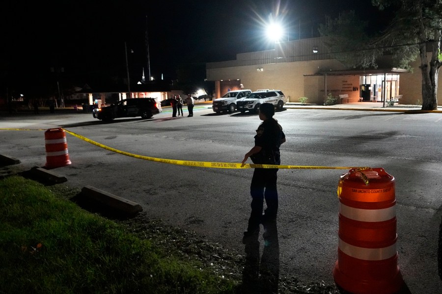 A law enforcement officer stands at the perimeter set outside the San Jacinto County Jail after the suspected gunman in a mass shooting arrived Tuesday, May 2, 2023, in Coldspring, Texas. Francisco Oropeza, who allegedly shot five of his neighbors, including a child, was captured Tuesday in Montgomery County and transferred to the jail Tuesday night. (AP Photo/David J. Phillip)
