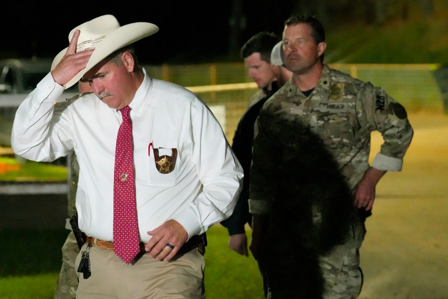 San Jacinto County Sheriff Greg Capers, left, walks to a news conference announcing the arrest of murder suspect Francisco Oropeza on Tuesday, May 2, 2023, in Cleveland, Texas. Law enforcement officials captured Oropeza on Tuesday night at a home near Houston, ending a four-day manhunt for a suspect who police believe fled after a mass shooting that left five dead. (Brett Coomer/Houston Chronicle via AP)