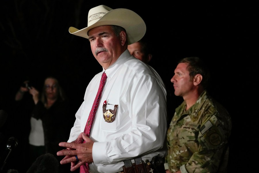San Jacinto County Sheriff Greg Capers speaks to the media during a news conference announcing the arrest of murder suspect Francisco Oropeza on Tuesday, May 2, 2023, in Cleveland, Texas. Law enforcement officials captured Oropeza on Tuesday night at a home near Houston, ending a four-day manhunt for a suspect who police believe fled after a mass shooting that left five dead. (Brett Coomer/Houston Chronicle via AP)