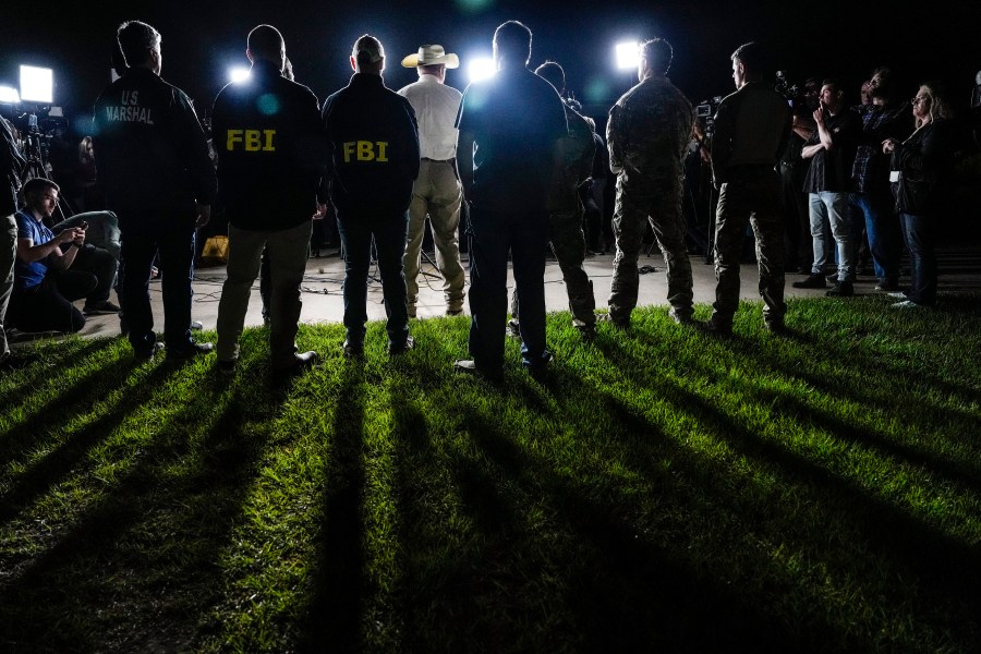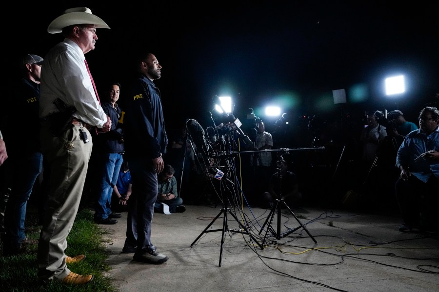 San Jacinto County Sheriff Greg Capers, left, and FBI assistant Special Agent in Charge Jimmy Paul speak to the media during a news conference announcing the arrest of murder suspect Francisco Oropeza on Tuesday, May 2, 2023 in Cleveland, Texas. Law enforcement officials captured Oropeza without incident on Tuesday night at a home near Houston, ending a four-day manhunt for a suspect who police believe fled after a mass shooting that left five dead. (Brett Coomer/Houston Chronicle via AP)