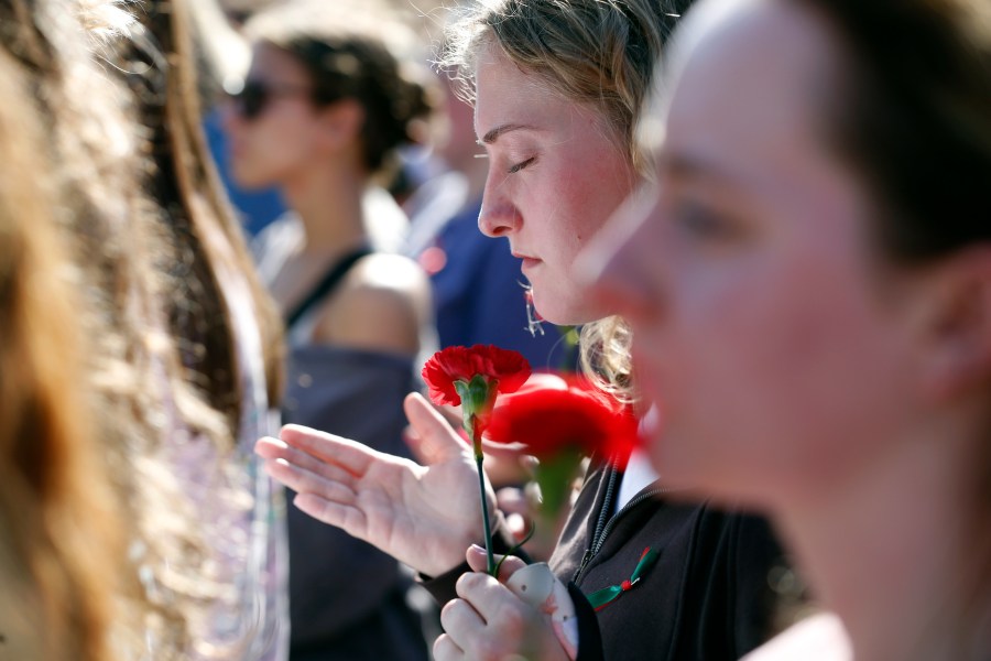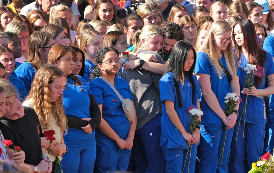 Family and friends carried flowers and passed out red and green ribbons in remembrance of the late nursing student, holding each other up as they cried.