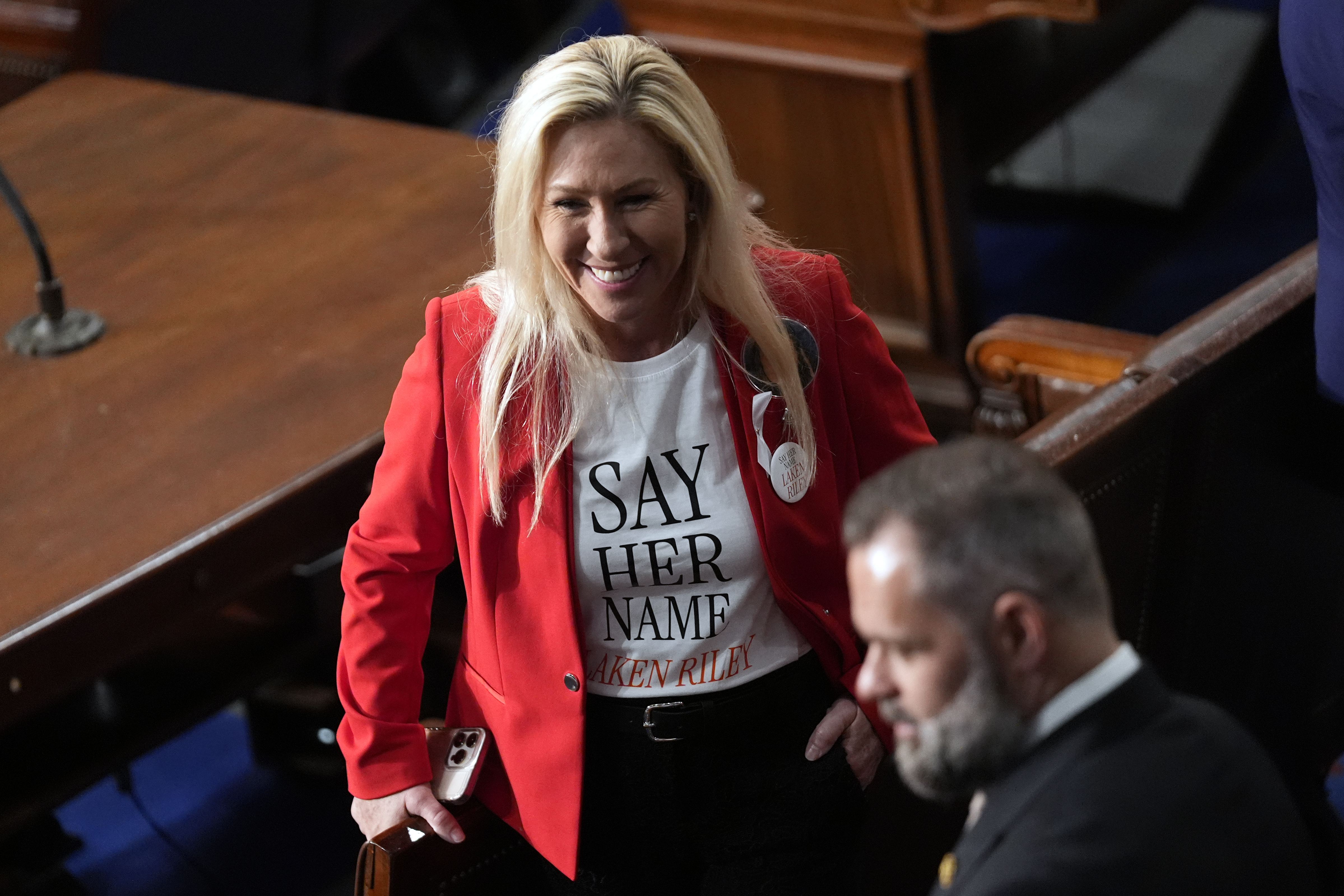 At the State of the Union address, Biden held up a pin with Riley’s name on it as Greene shouted from the gallery: “Say her name!”