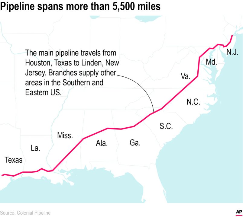 The pipeline, operated by Georgia-based Colonial Pipeline, carries gasoline and other fuel from Texas to the Northeast. It delivers roughly 45% of fuel consumed on the East Coast, according to the company.