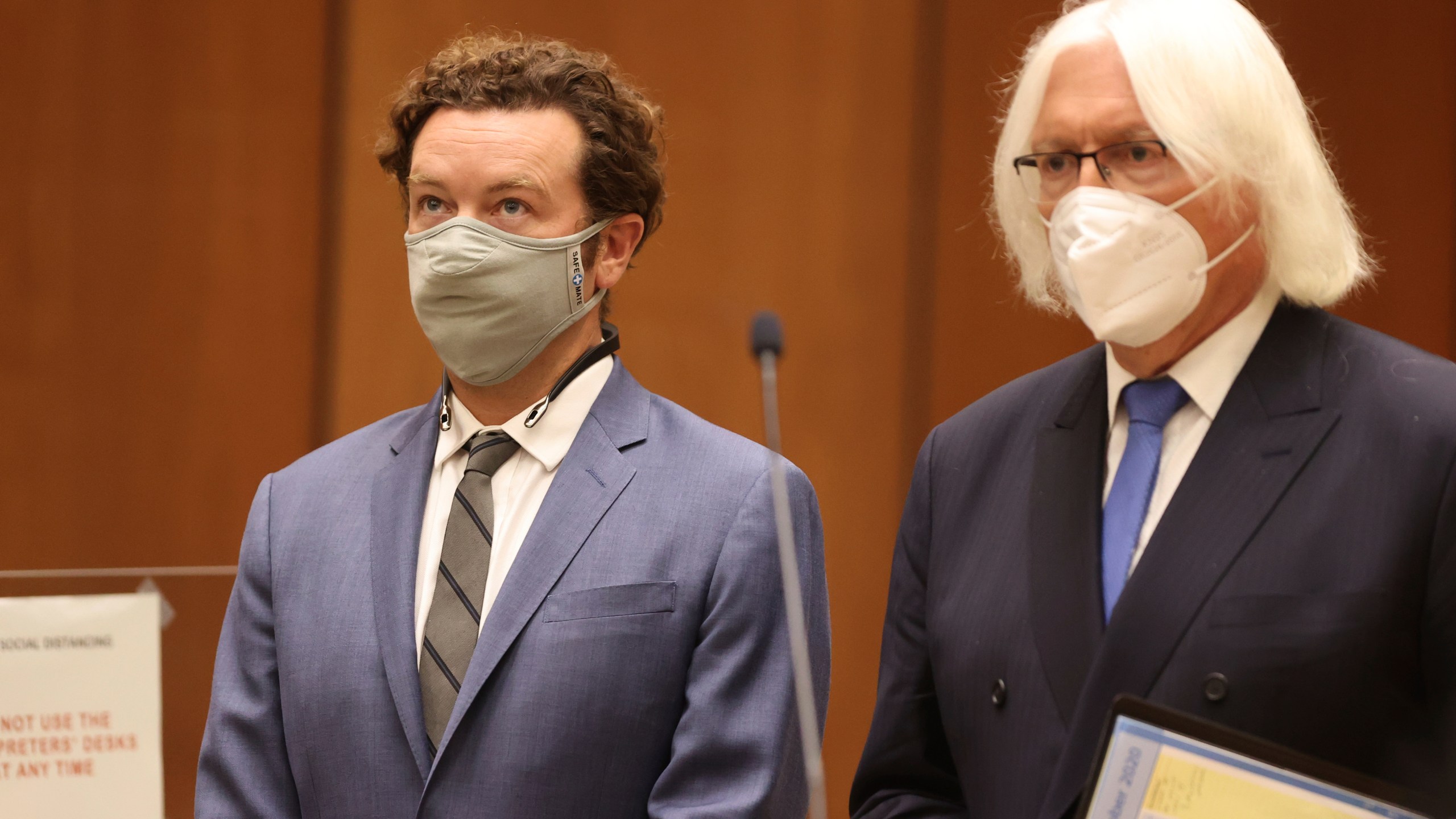 Masterson, 44, who has been free on bail since his June arrest, stood in court in a blue suit and face mask next to attorneys Tom Mesereau and Sharon Appelbaum, as the three women sat in the gallery.