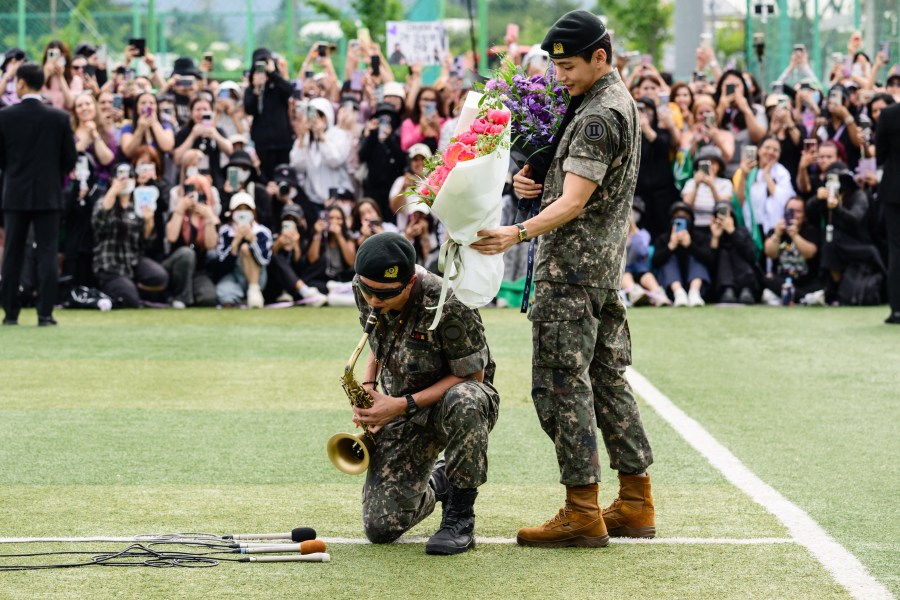 K-pop boy band BTS members RM (L) plays the saxophone while V looks on while holding flower bouquets at an outdoor sporting facility in Chuncheon on June 10, 2025, after their release from 18 months of South Korean military service. Hundreds of fans gathered near two army bases just outside of the capital Seoul where band leader RM — recently named “Favorite K-pop Artist” at the American Music Awards — and singer V were discharged. (Photo by ANTHONY WALLACE / AFP) (Photo by ANTHONY WALLACE/AFP via Getty Images)