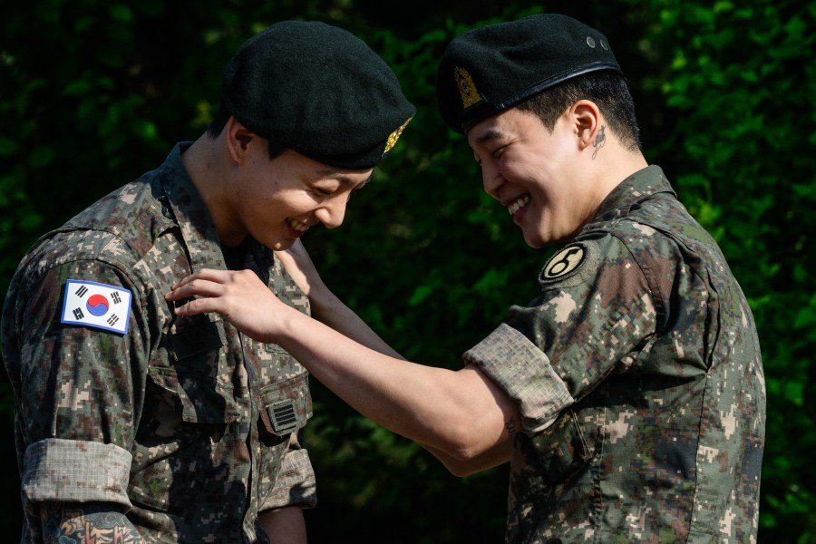 YEONCHEON-GUN, SOUTH KOREA – JUNE 11: K-pop band BTS’s members Jungkook (L) and Jimin (R) salute after being discharged from a mandatory military service on June 11, 2025 in Yeoncheon-gun, South Korea. Four members of the K-pop group BTS’s RM, V, Jimin and Jungkook will be discharged from their mandatory 18-month military service next week, the boy band’s agency said. RM, the leader of the group, and V completed the 18-month mandatory military service, which is required for all able-bodied male citizens in South Korea before they turn 28, followed by Jimin and Jungkook the next day, according to BigHit Music. (Photo by Han Myung-Gu/Getty Images)