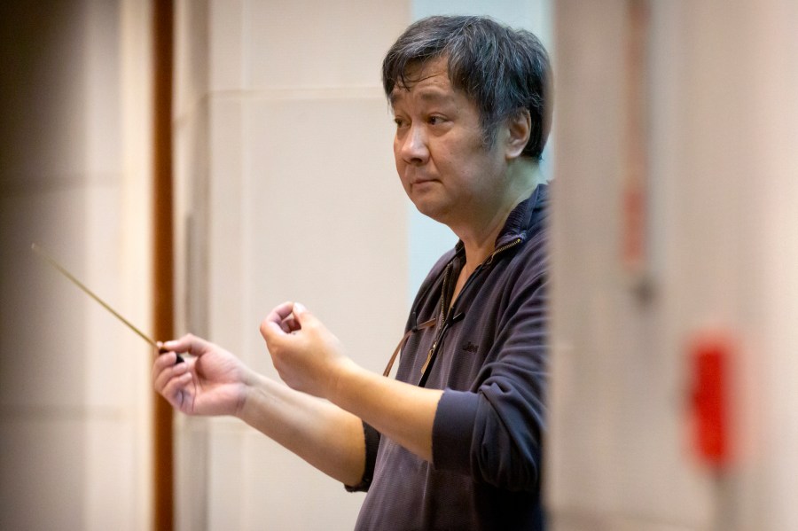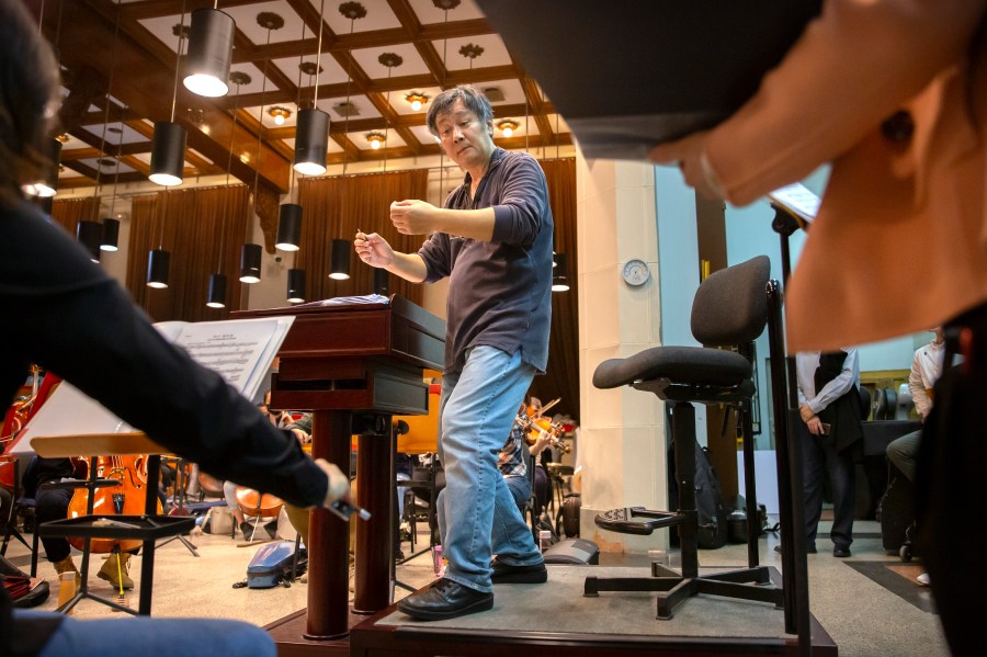 Conductor Zou Ye directs musicians from the Wuhan Philharmonic Orchestra as they rehearse a day before their concert to open the Beijing Music Festival, China’s first classical music festival since the beginning of the COVID-19 outbreak, in Beijing, Friday, Oct. 9, 2020. China is holding its first classical music festival since the outbreak of the coronavirus pandemic featuring musicians from the global epicenter of Wuhan, in an attempt to aid in the psychological and emotional healing process. (AP Photo/Mark Schiefelbein)
