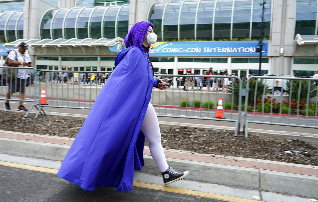 Monica Radin of San Diego, dressed as the Raven character in the animated television series “Teen Titans,” walks outside Preview Night at the 2022 Comic-Con International at the San Diego Convention Center, Wednesday, July 20, 2022, in San Diego. (AP Photo/Chris Pizzello)