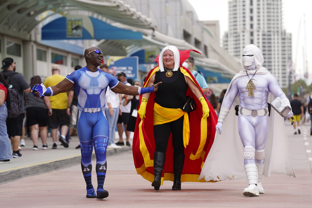 Jay Acey, left, dressed as A-Train from the television series “The Boys,” Faeren Adams, center, dressed as Marvel superhero Doctor Strange, and Derek Shackleton, dressed as Marvel superhero Moon Knight, walk together outside Preview Night at the 2022 Comic-Con International at the San Diego Convention Center, Wednesday, July 20, 2022, in San Diego. (AP Photo/Chris Pizzello)