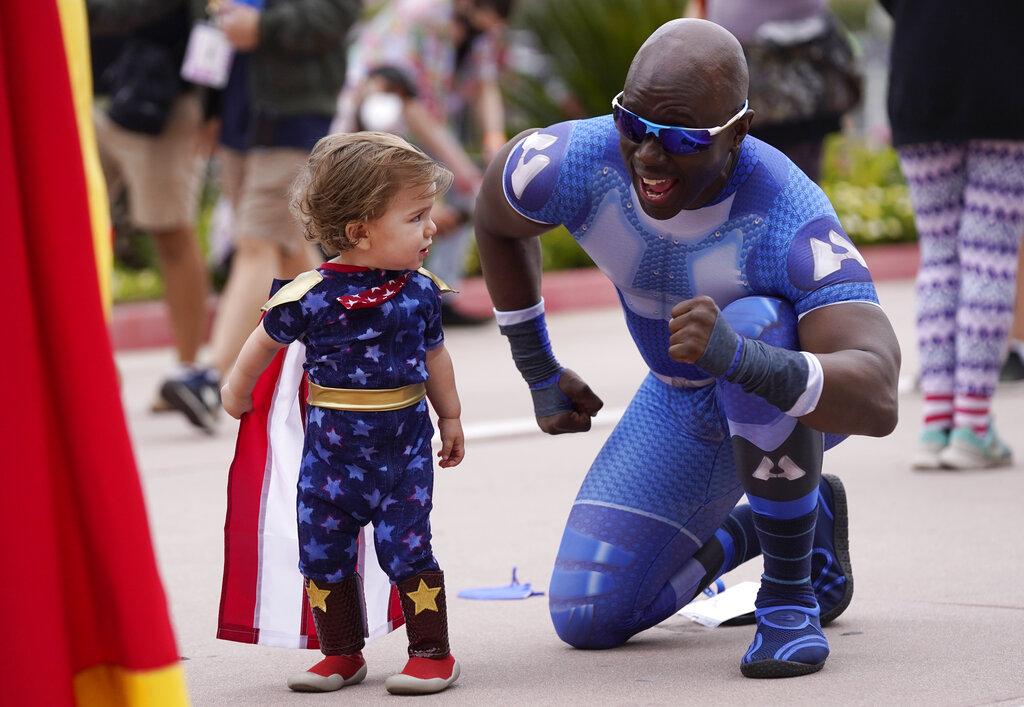 Jay Acey, right, dressed as A-Train from the television series “The Boys,” mingles with Maddox Cruz, 1, of Orange, Calif., outside Preview Night at the 2022 Comic-Con International at the San Diego Convention Center, Wednesday, July 20, 2022, in San Diego. (AP Photo/Chris Pizzello)