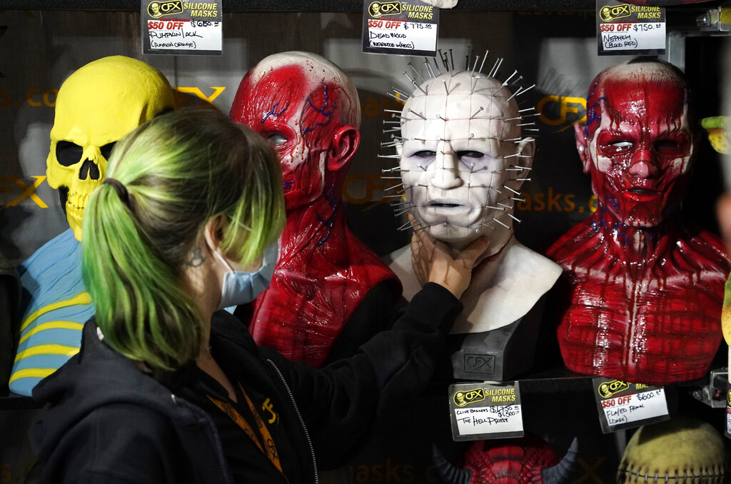 Jenn Brown of CFX (Composite Effects) adjusts a silicon mask based on Pinhead from the movie franchise “Hellraiser” in their stall during Preview Night at the 2022 Comic-Con International at the San Diego Convention Center, Wednesday, July 20, 2022, in San Diego. (AP Photo/Chris Pizzello)