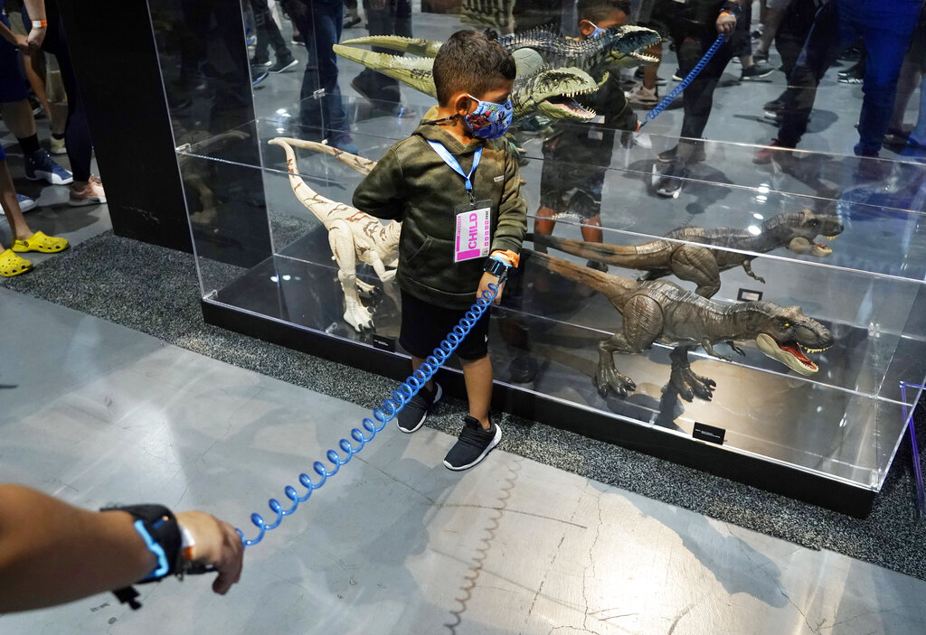 Calvin Alvarez, 4, of Los Angeles, peers over his shoulder at dinosaur models based on the “Jurassic” Park film franchise during Preview Night at the 2022 Comic-Con International at the San Diego Convention Center, Wednesday, July 20, 2022, in San Diego. (AP Photo/Chris Pizzello)