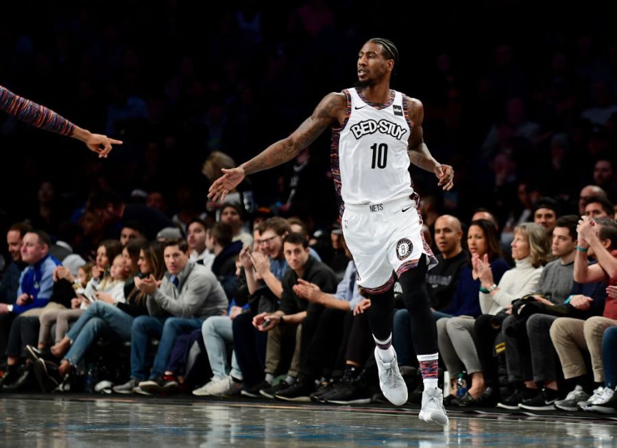 NEW YORK, NEW YORK – NOVEMBER 29: Iman Shumpert #10 of the Brooklyn Nets celebrates after his three pointer during the first half of their game against the Boston Celtics at Barclays Center on November 29, 2019 in New York City. NOTE TO USER: User expressly acknowledges and agrees that, by downloading and or using this Photograph, user is consenting to the terms and conditions of the Getty Images License Agreement. (Photo by Emilee Chinn/Getty Images)
