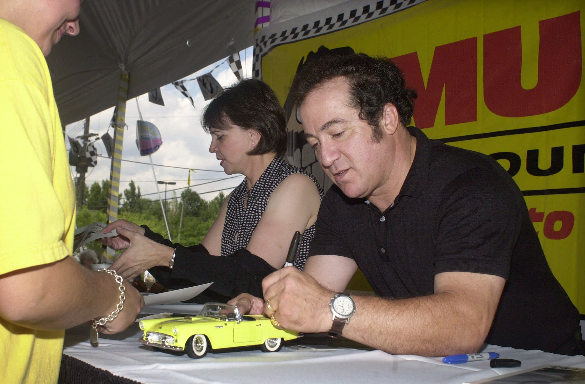 Eddie Mekka, right, former star of the television show “Laverne and Shirley” signs a model of a 1955 Thunderbird for Dawn Pascoe, left, of South Lyon, Mich. on Saturday, Aug. 18, 2001 in Royal Oak, Mich. during the Woodward Dream Cruise. Show star Cindy Williams, who played Shirley on the show, is at center. The Dream Cruise, a event featuring classic cars cruising through a number of southeast Michigan cities along Woodward Ave., is Saturday. Organizers expect over one million people to line Woodward Ave. for the event. (AP Photo/Paul Warner)